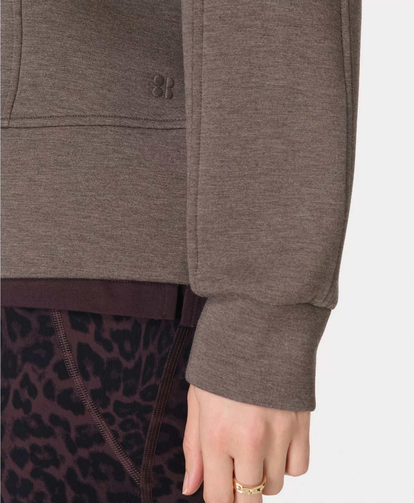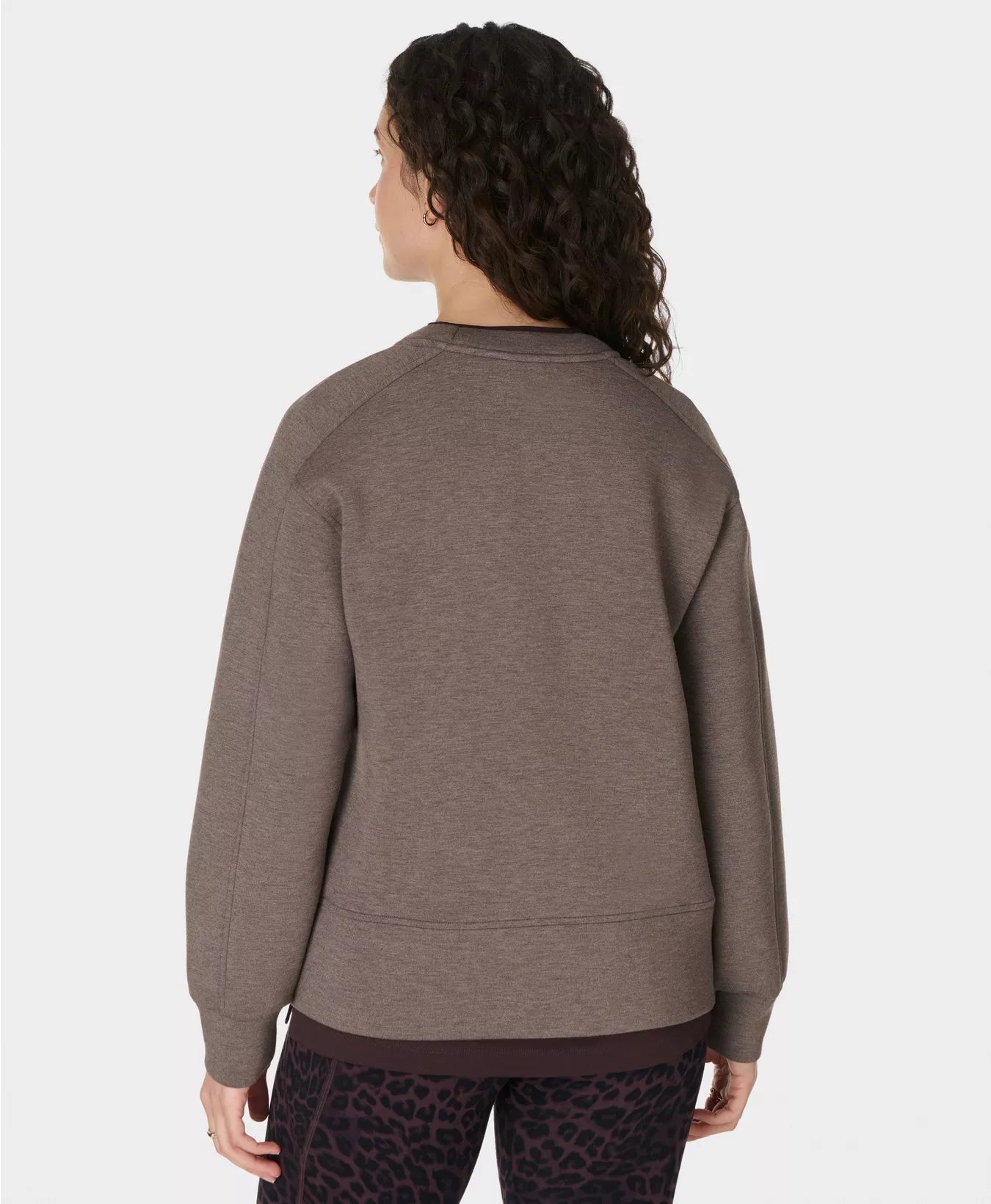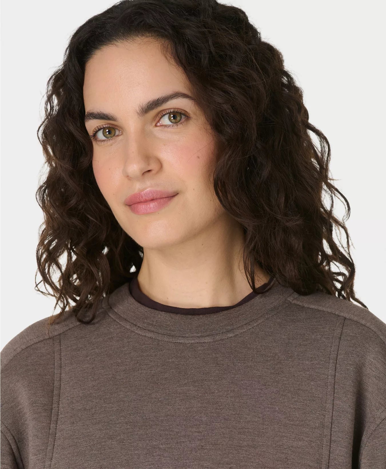 Sweaty Betty Wind Down Crew Neck Pullover SB10255B-LBRN in light brown, constructed from 83% Viscose and 11% Polyamide and 6% Elastane with stitch detailing.