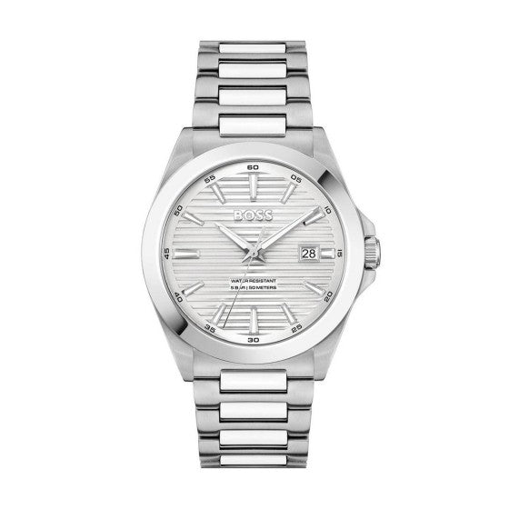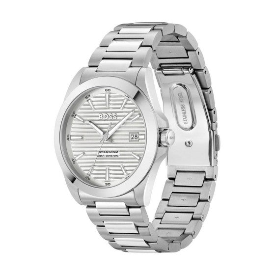 The BOSS Strike offers clean, minimalist design for men who prefer understated elegance over bold statement pieces. At 41mm, it sits in the versatile mid-size range — substantial enough for presence, refined enough for shirt cuffs. The textured silver dial with baton indices keeps legibility sharp, while the date aperture at 3 o'clock adds everyday practicality without cluttering the face.