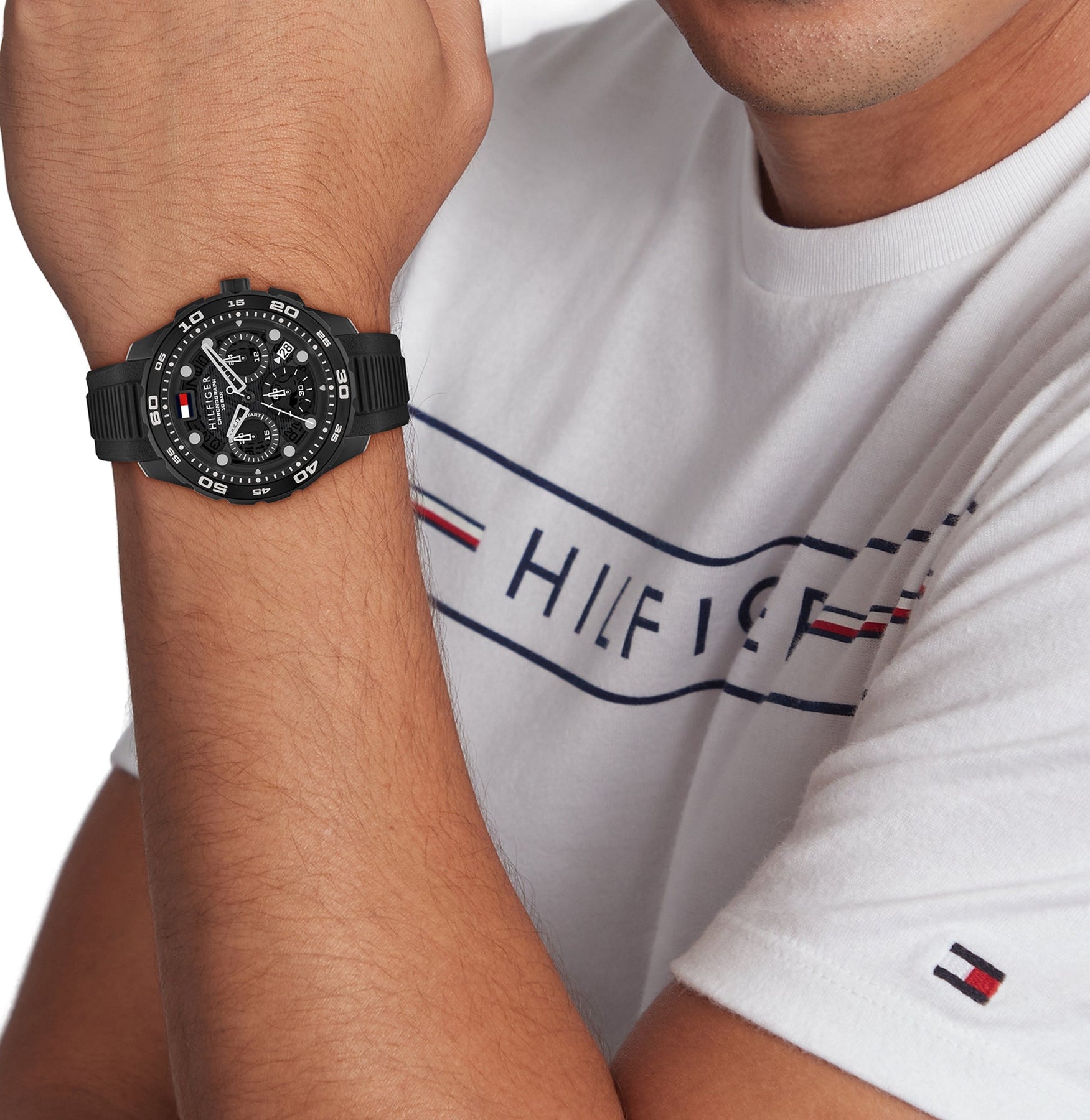 Experience timeless elegance with the Tommy Hilfiger Black Regatta Chronograph Watch. Featuring a sleek black dial with precise chronograph functionality, this timepiece combines style and performance effortlessly. The black silicone strap offers a comfortable fit, making it an ideal accessory for both formal occasions and everyday refinement. Designed for those who appreciate subtle sophistication, this watch enhances your look with a modern yet classic appeal.