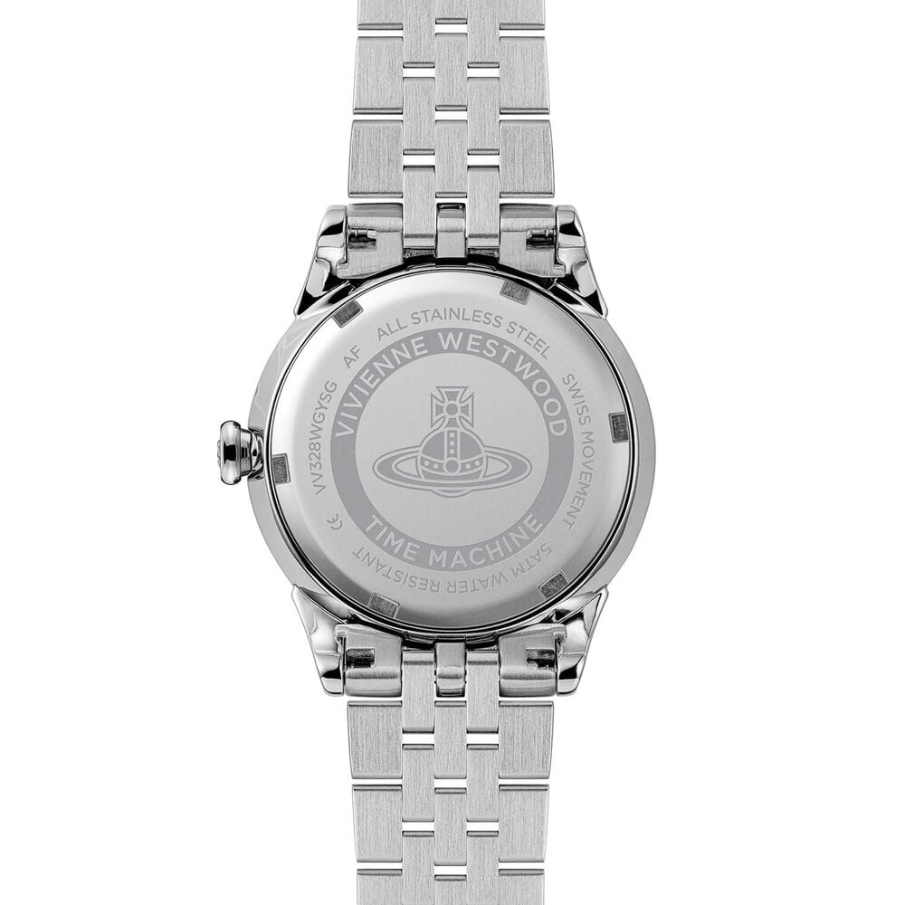 Back of a silver Vivienne Westwood watch.