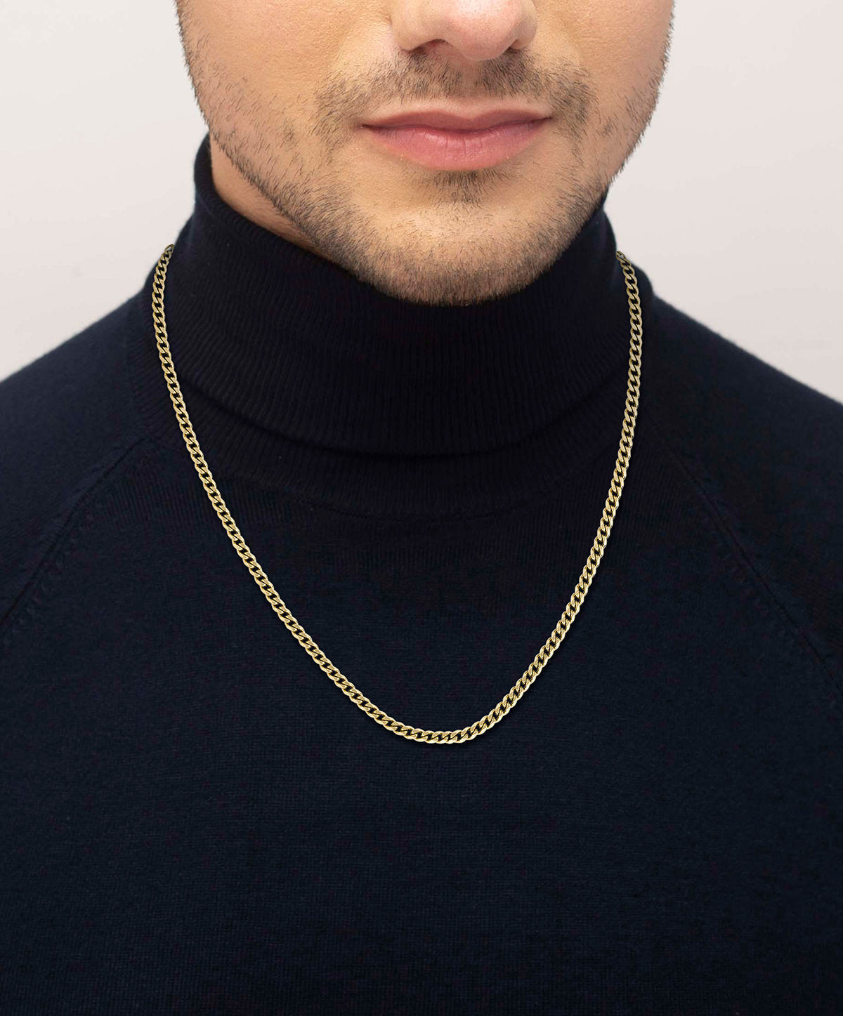 Man wearing a gold plated chain necklace, showcasing its style and length. Stainless steel jewelry.