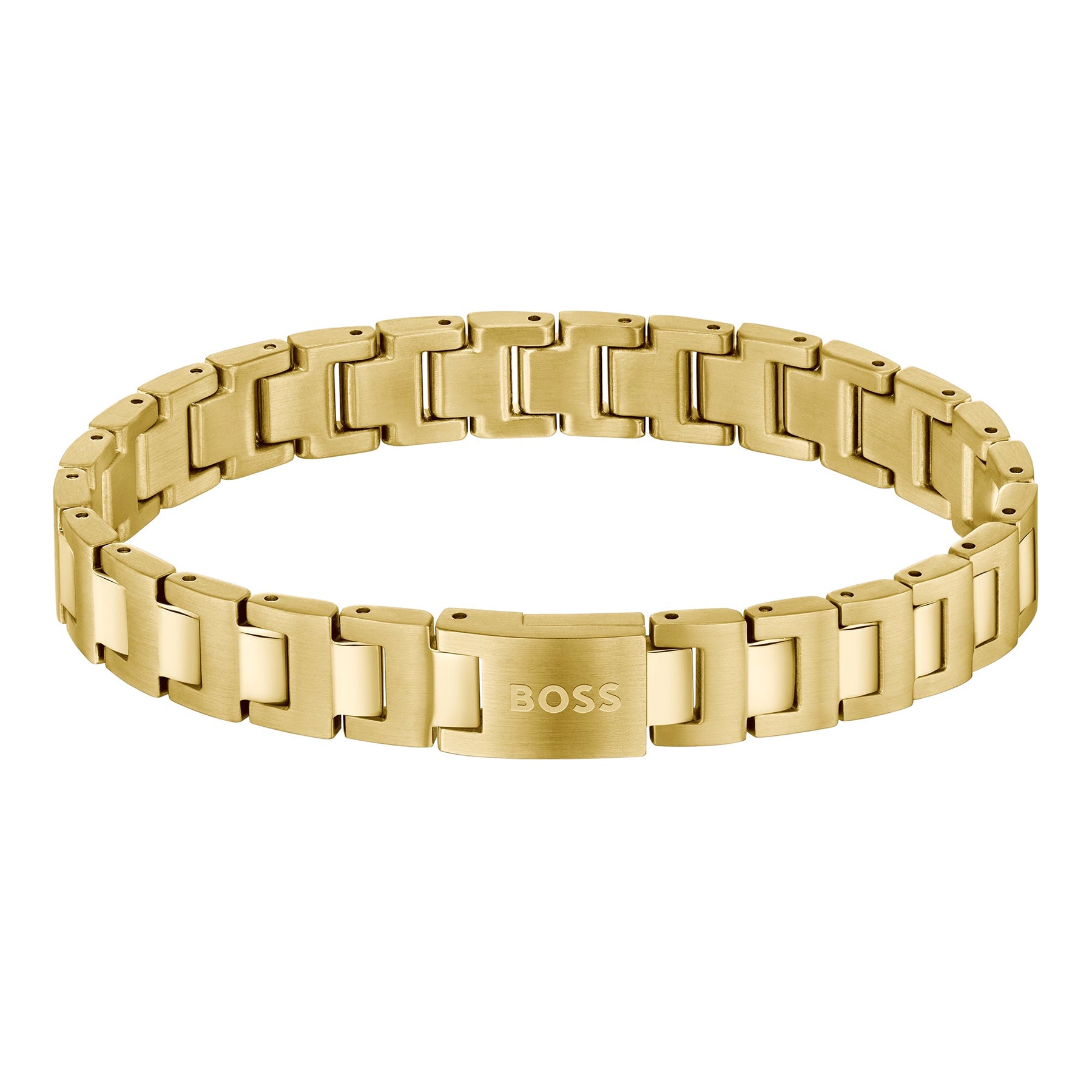Elevate your style with the BOSS Mens Gold Plated Stainless Steel Candor Bracelet. Crafted from durable stainless steel with a refined gold plating, this bracelet offers a sleek, modern look that complements any outfit. Its sturdy design ensures lasting wear while adding a touch of sophistication to your wrist—perfect for both daily wear and special occasions.