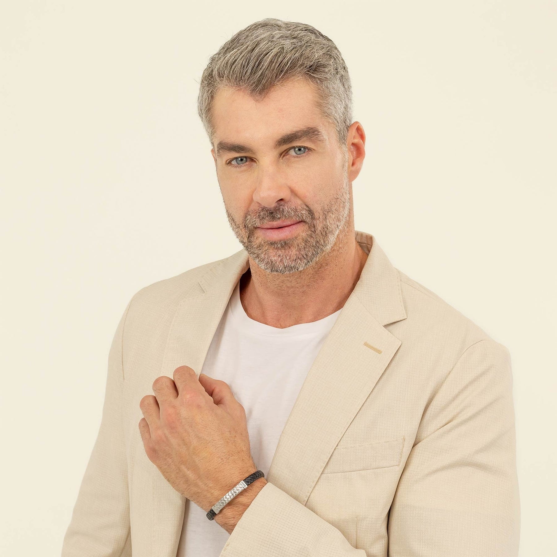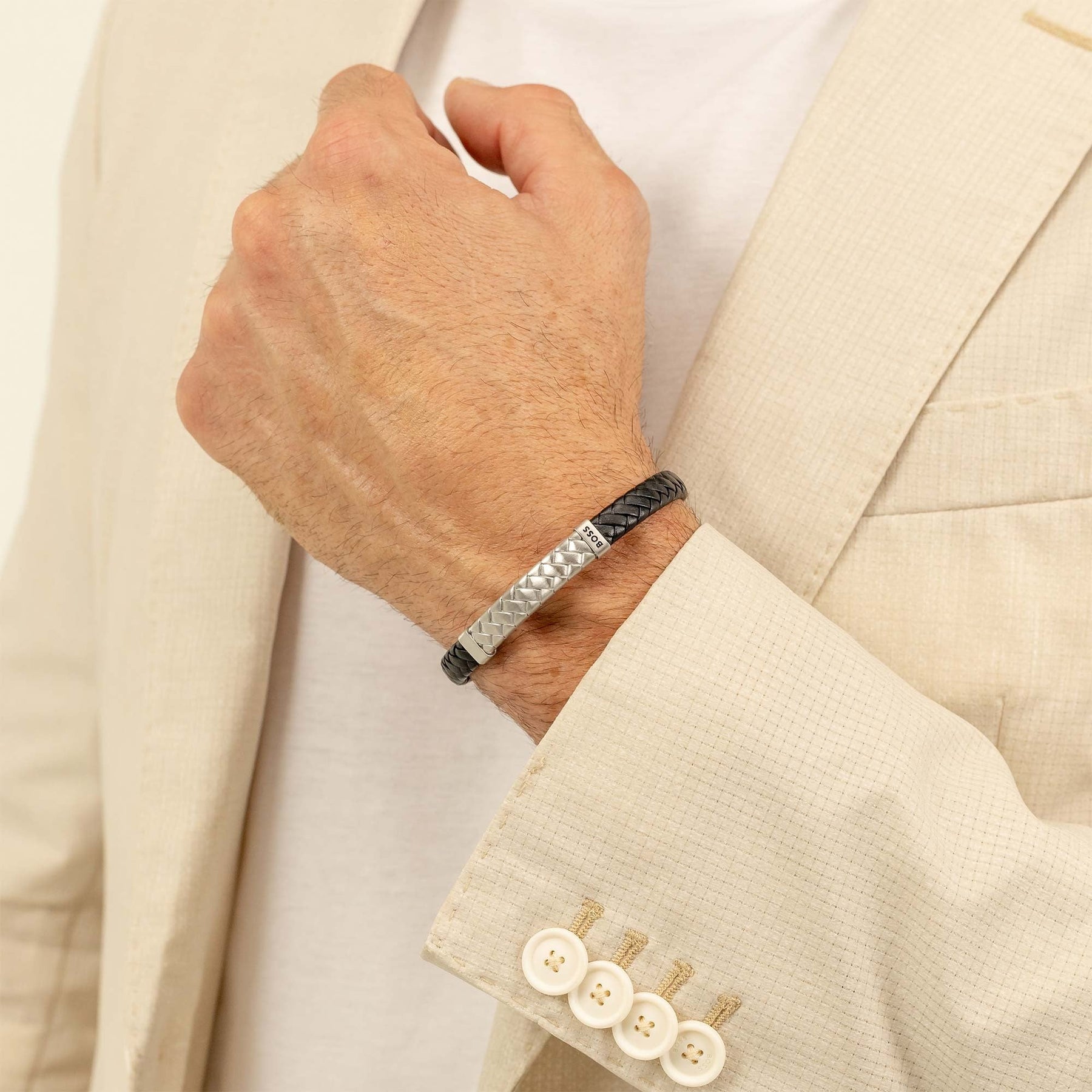 BOSS MensTailored Braided Bracelet Black Leather and Stainless Steel *