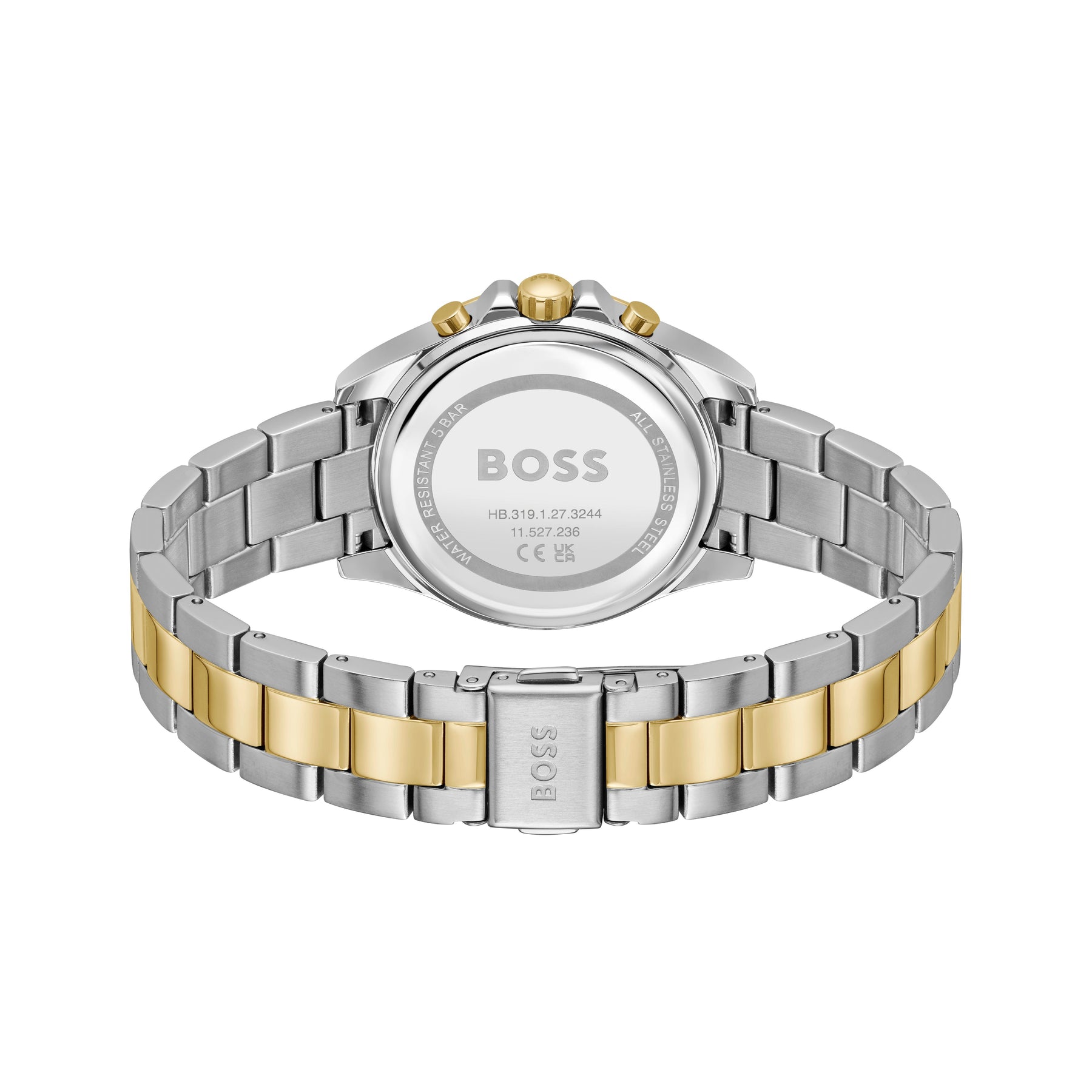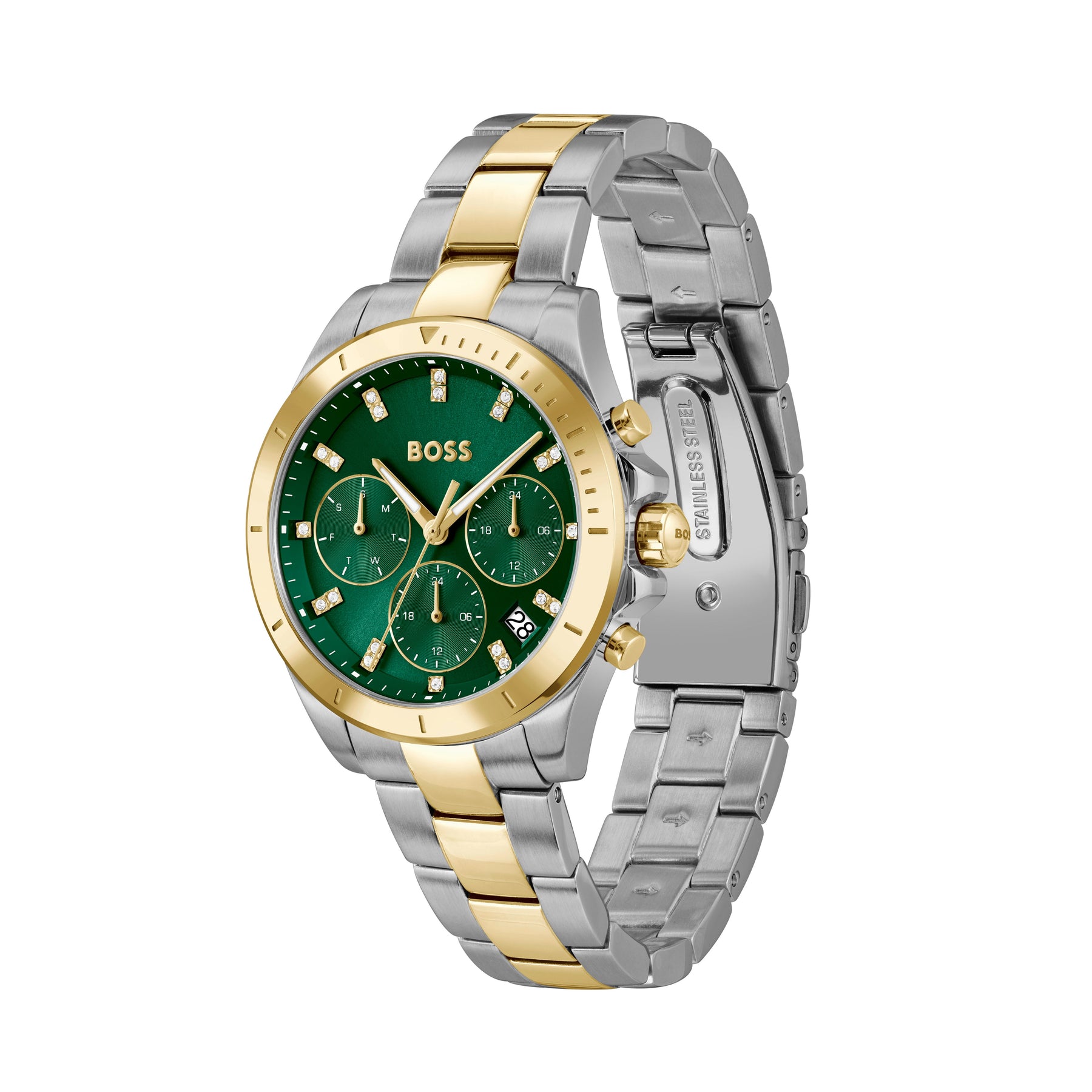 Elevate your elegance with the BOSS Ladies Alley Sports Luxe watch, featuring a striking green dial set within a stainless steel case exquisitely coated in gold plating. The refined bracelet design complements the luxurious aesthetic, offering both durability and style for the discerning wearer. This timepiece perfectly balances sporty sophistication with classic charm, making it an exceptional accessory for any occasion.