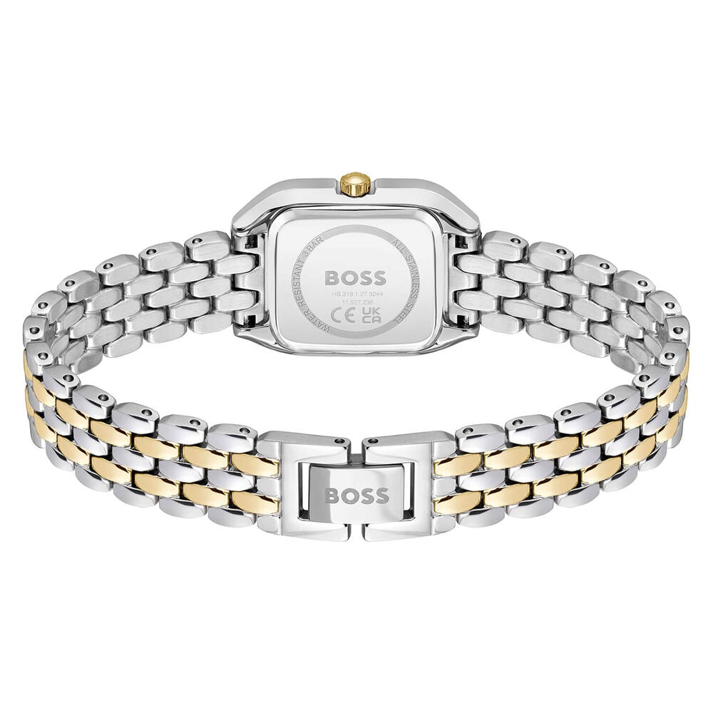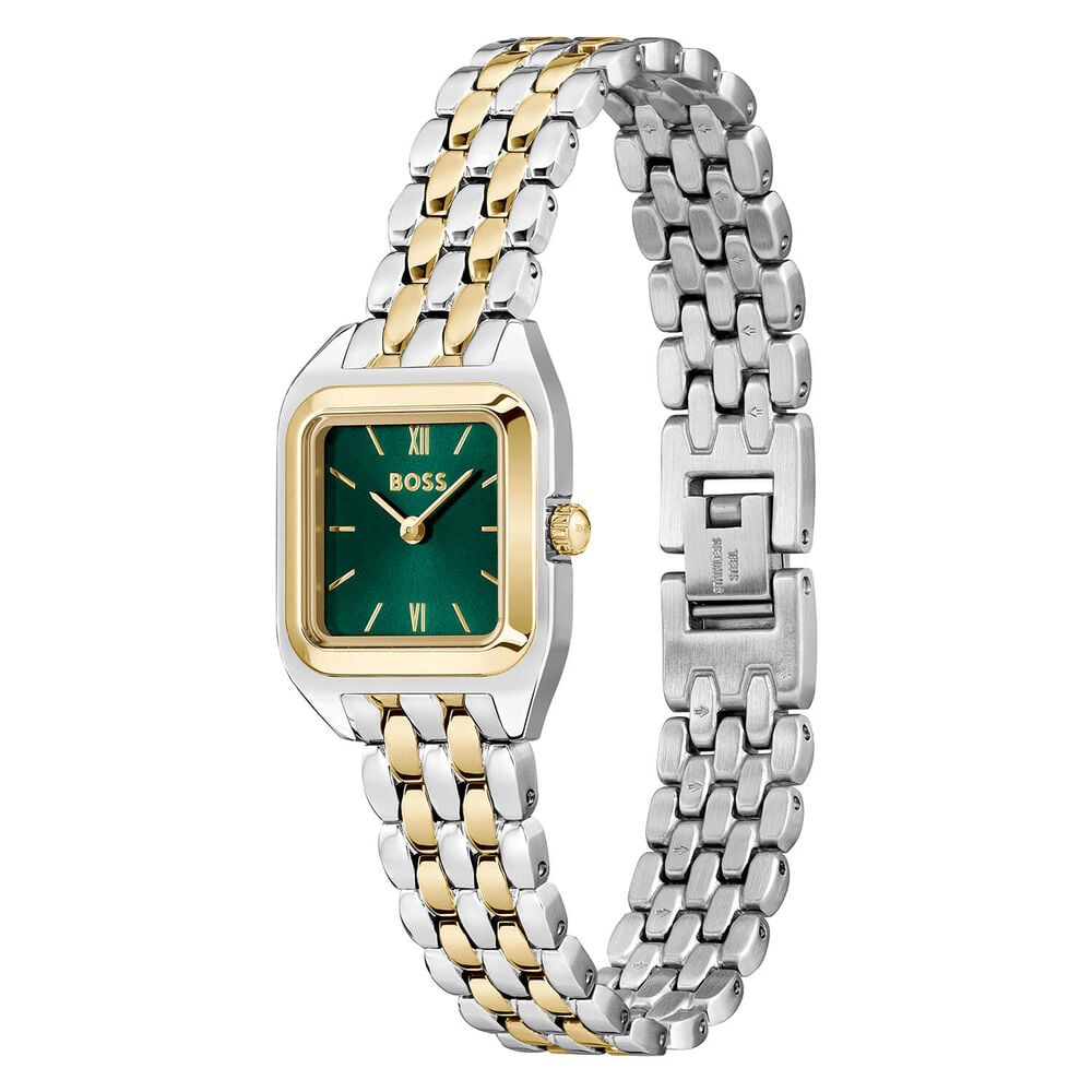 Elevate your everyday elegance with this BOSS Mae Petite bracelet watch, a refined timepiece that seamlessly blends contemporary design with timeless sophistication. The striking two-tone case pairs beautifully with a captivating green dial, creating a distinctive look that complements both professional and casual settings. Crafted with precision engineering and premium materials, this petite watch delivers both style and reliability. The integrated bracelet ensures a polished finish from wrist to dial, making it an essential accessory for the modern woman who values quality and understated luxury.