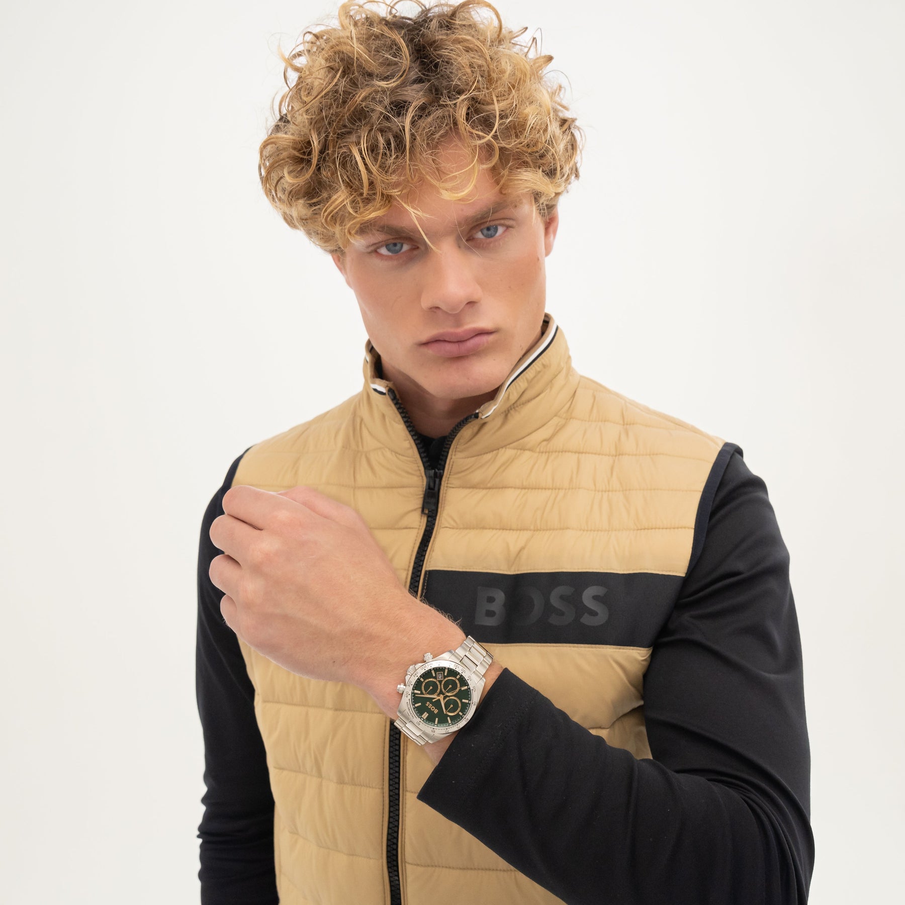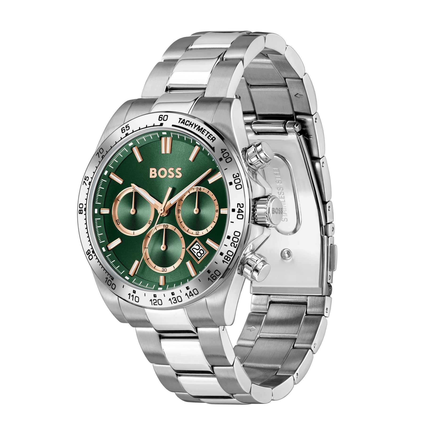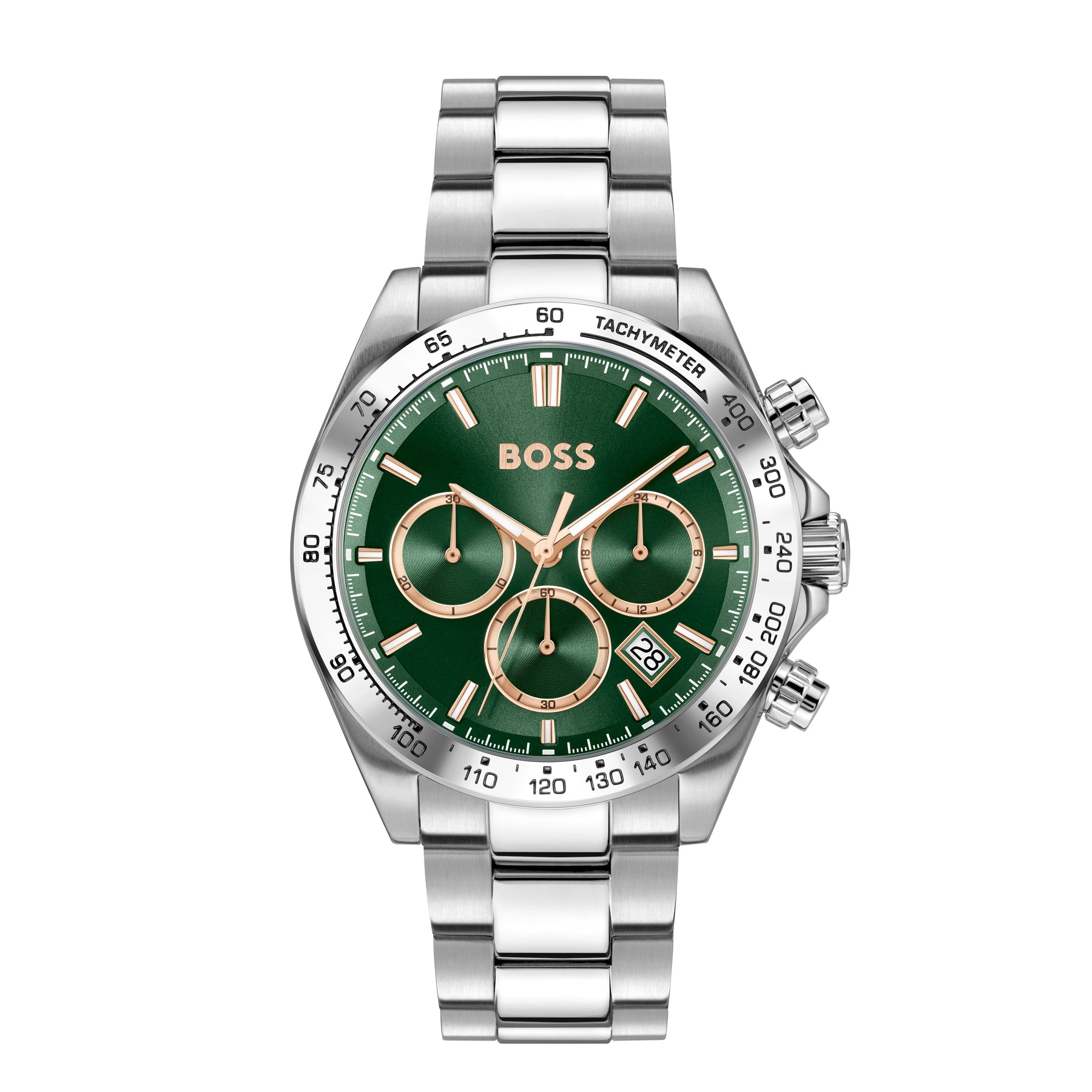 Elevate your style with the BOSS Mens Stainless Steel Hero 2.0 watch, featuring a striking green dial complemented by a polished stainless steel bracelet. This timepiece combines refined craftsmanship with modern design, offering durable wear and a distinctive look suited for both formal and casual occasions. Its precise movement ensures reliable timekeeping, making it an essential accessory for the discerning gentleman.
