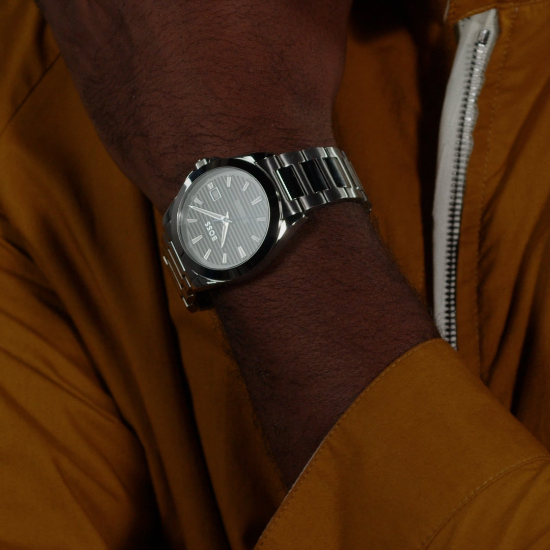 Man wearing BOSS Strike watch, showcasing dial and stainless steel band. Stylish wrist accessory.