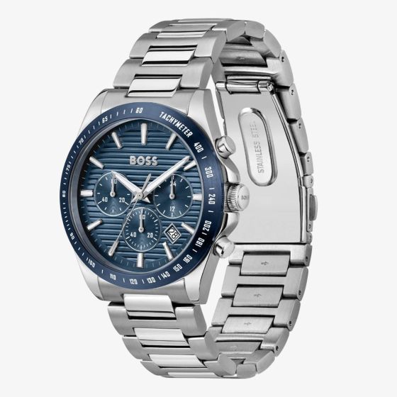 Experience the BOSS Strike Chronograph Blue Dial Stainless Steel Watch by BOSS, offering precise chronograph timing and timeless style for everyday wear and formal occasions.