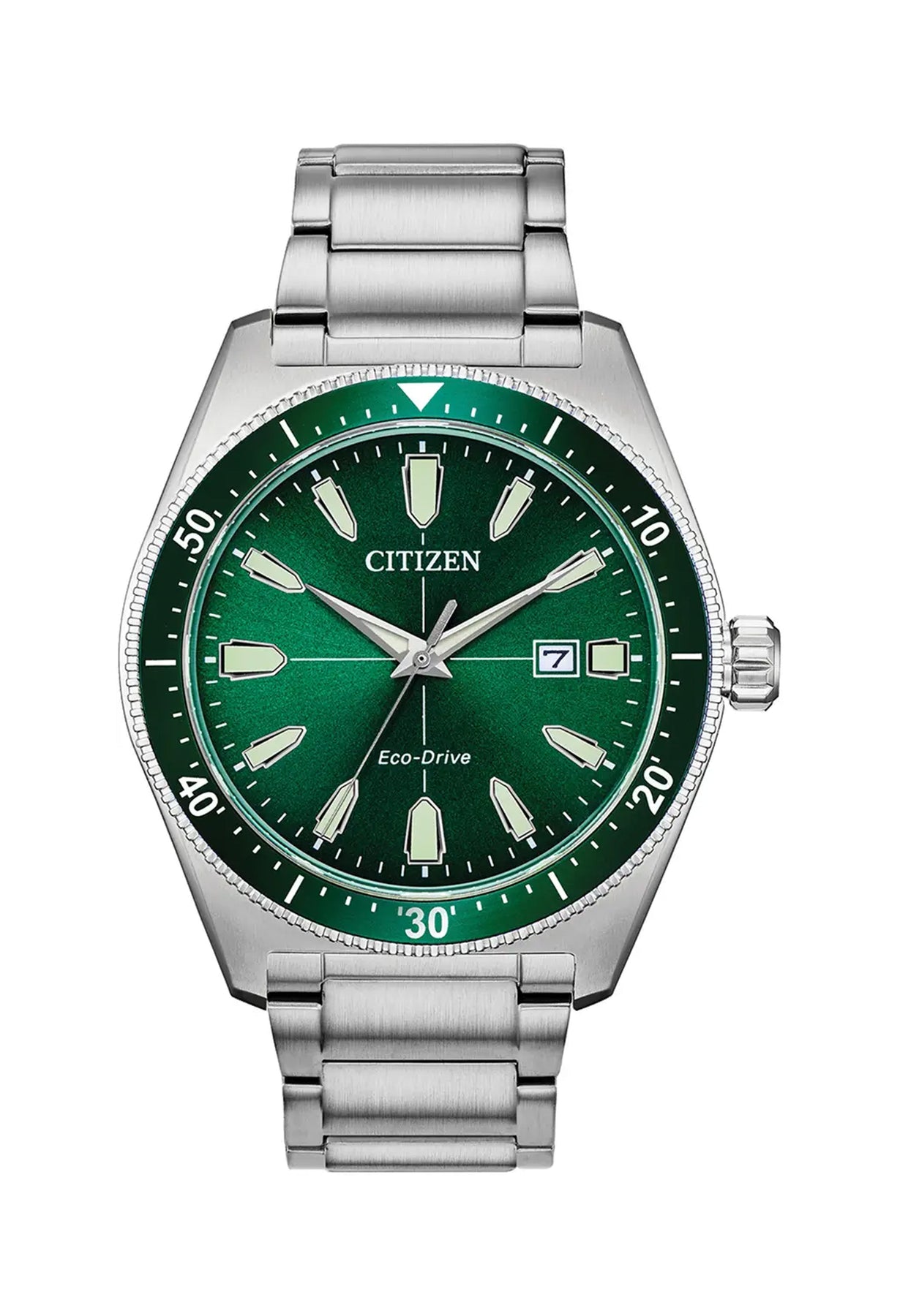 Citizen Eco-Drive watch, featuring a green dial, date display, & stainless steel band. Showcases the Sport design.