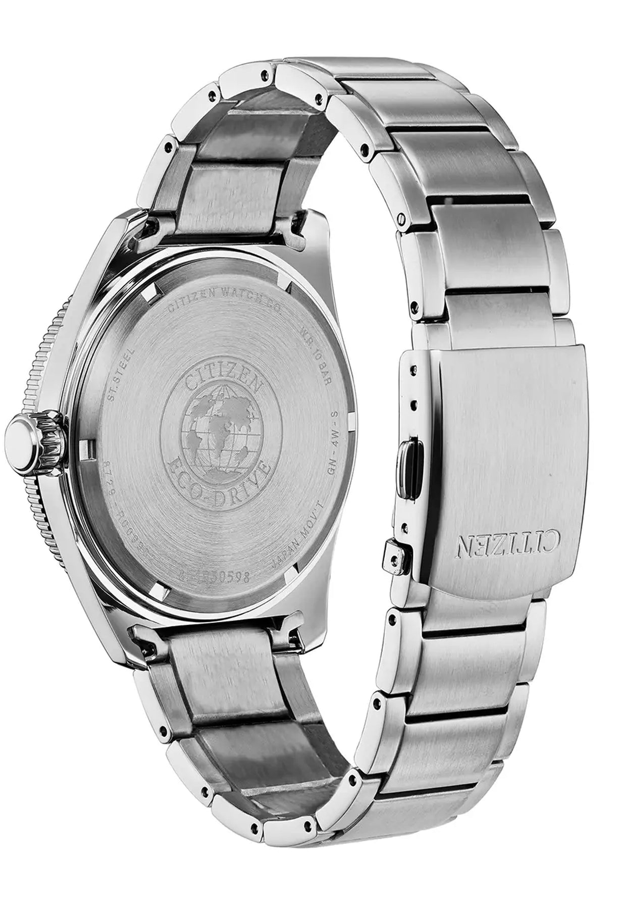 Close-up showing the back of the Citizen Eco-Drive sports watch, highlighting stainless steel case and band, with Eco-Drive