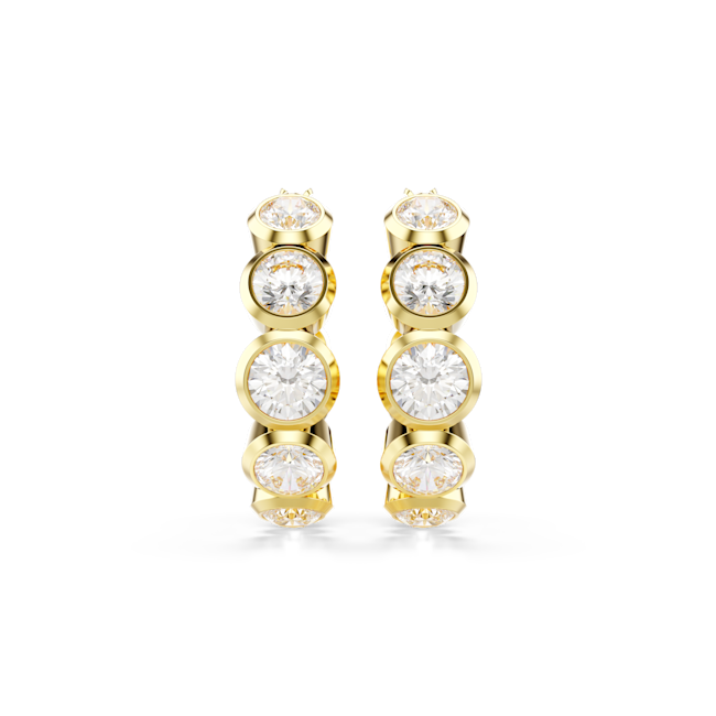 The Swarovski Imber hoop earrings are 18k gold-plated mini hoops set with a full circle of round-cut Swarovski Zirconia, arranged in a graduated size sequence along the front arc of the hoop to create a compact profile with controlled light variation.
