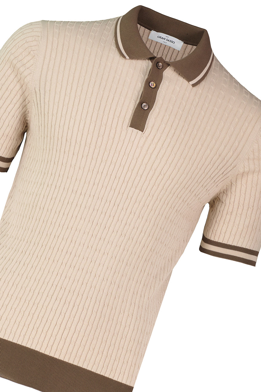 Gran Sasso 57113/20625/010 knitted polo shirt in 100% cotton with cable knit construction and a three-button placket.