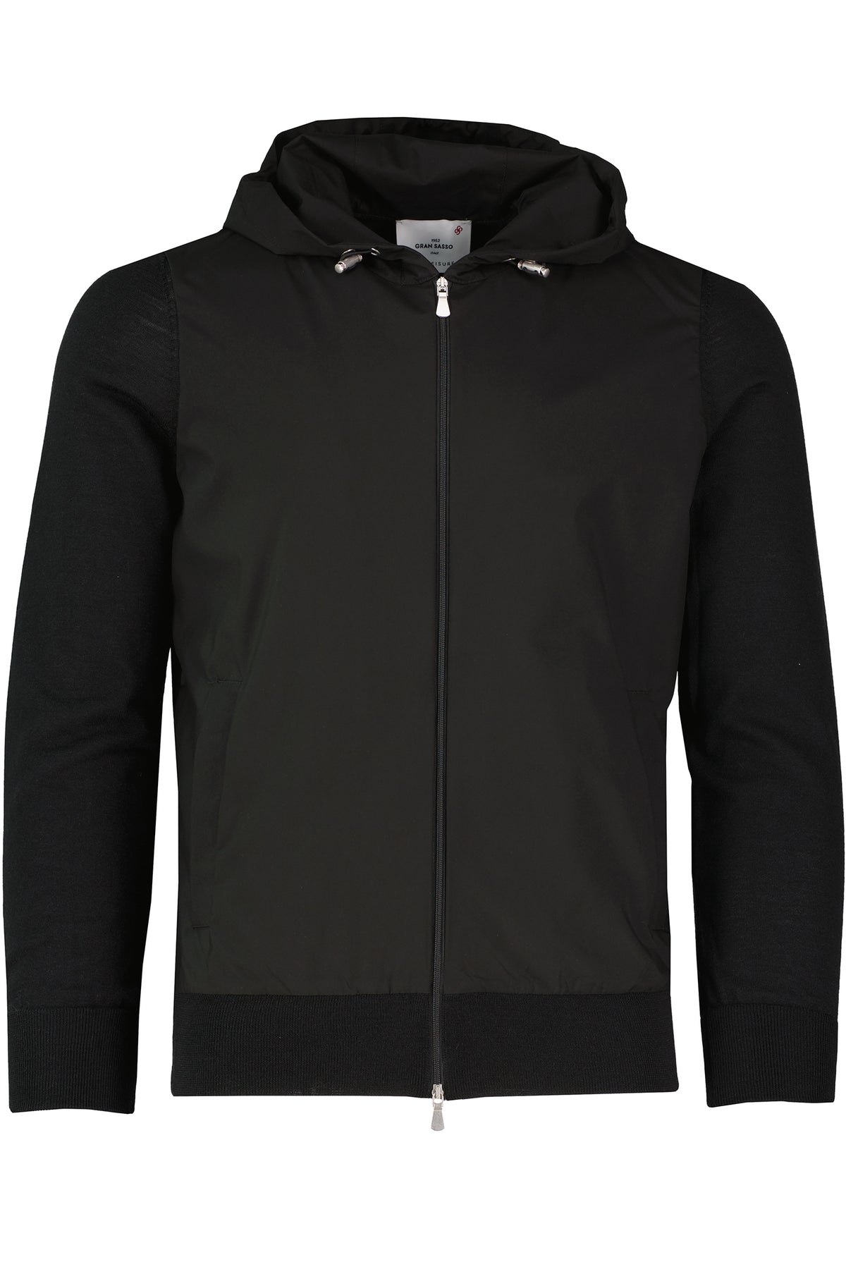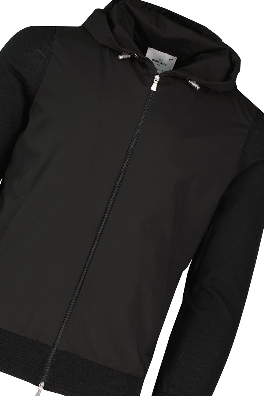 Gran Sasso Hoodie Hybrid Jacket in black (43159/14527/099) — Italian-made hybrid construction combining knitted body with technical panelling.