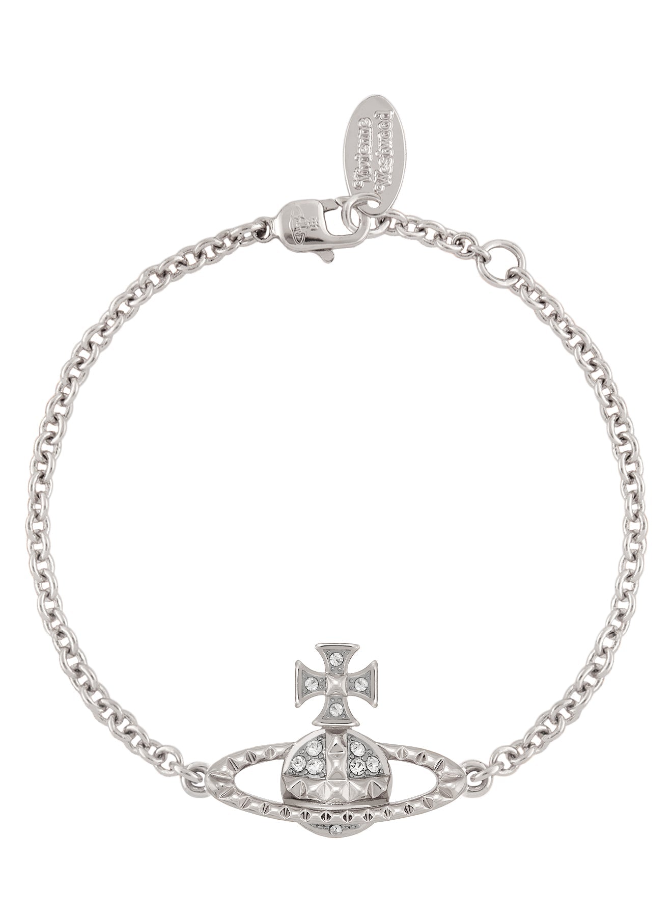 Vivienne Westwood Mayfair Bas Relief bracelet in rhodium-tone plating with clear crystal detailing. An adjustable chain bracelet with crystal-set Orb charm, suited to silver jewellery stacks, monochrome outfits, and pairing with cool-toned watches or cuffs.