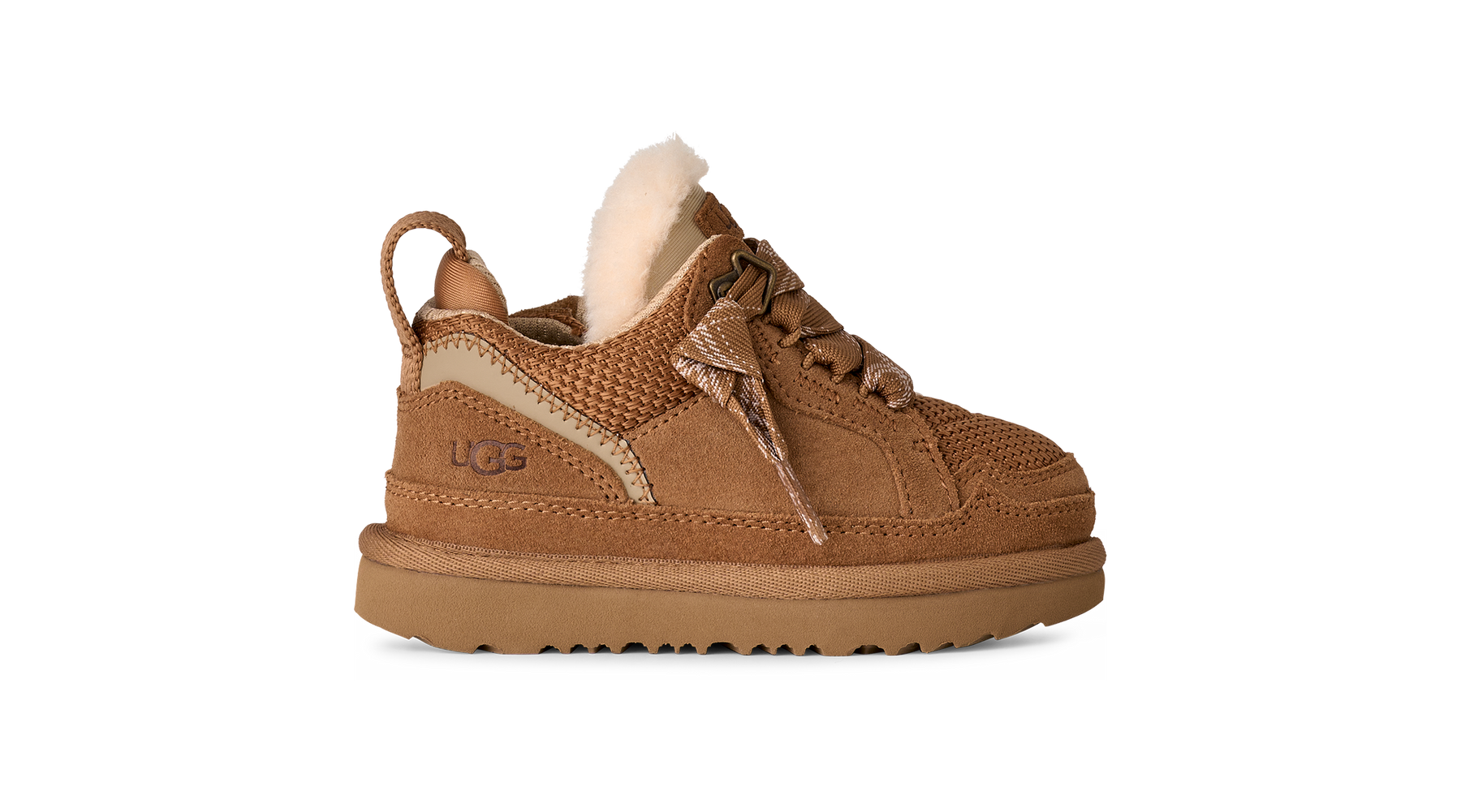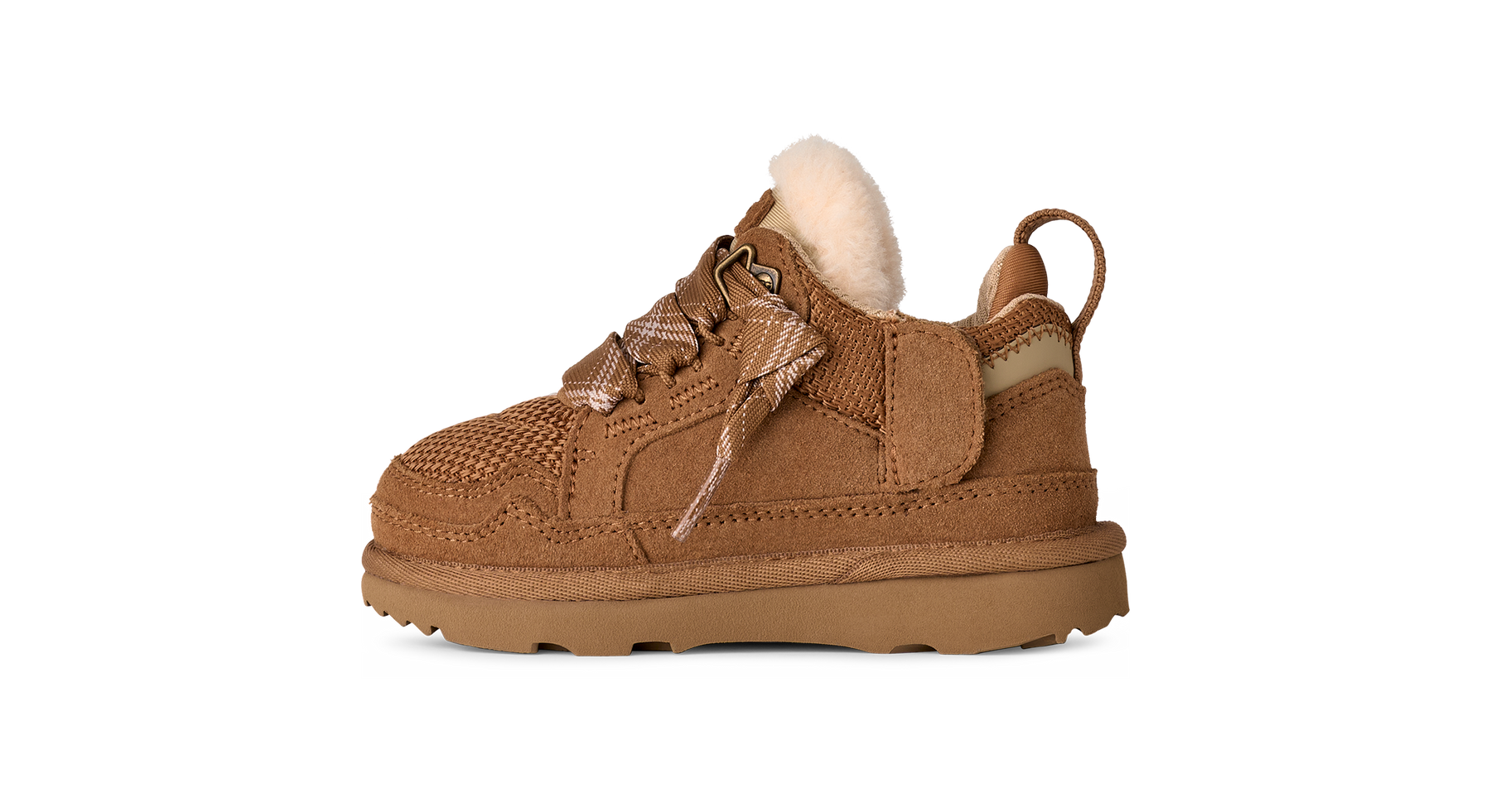 UGG toddler trainer in Chestnut, constructed with a suede and textile upper, breathable mesh vamp, and hook-and-loop closure for easy on/off.