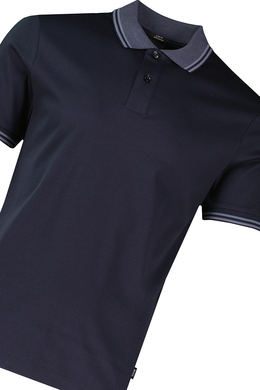 BOSS Mercerised Cotton Slim-Fit Polo Shirt 50559654-DBLU in dark blue, constructed from 100% mercerised cotton with contrast stripe trims.