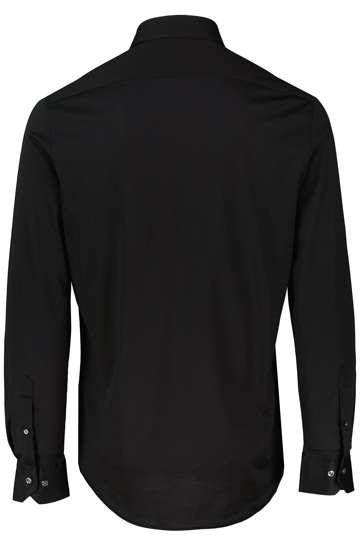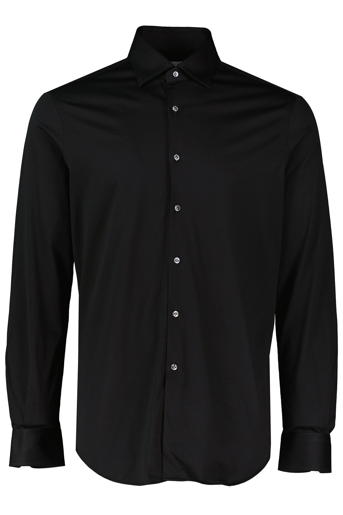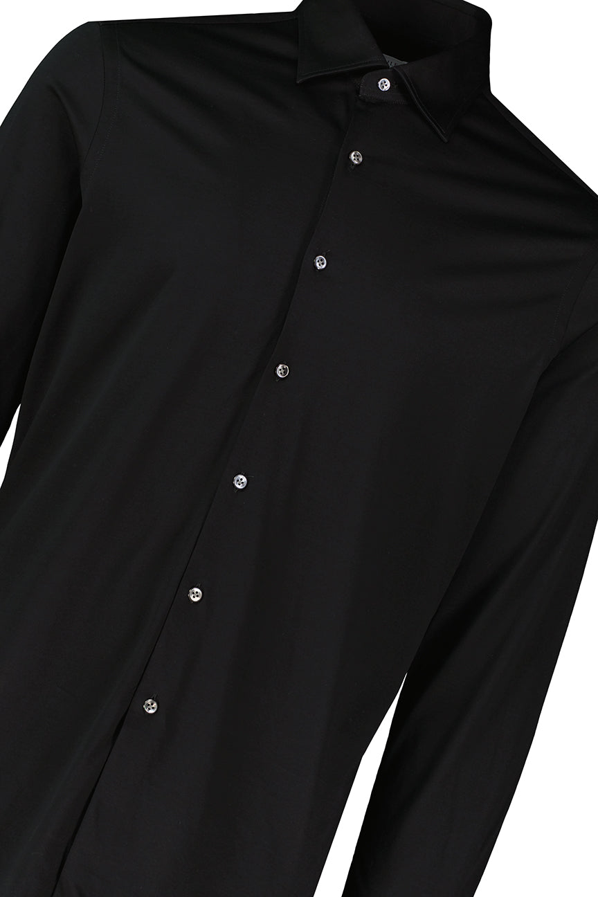 Part of the Pal Zileri Effortless Capsule, this black long sleeve shirt blends modern sophistication with everyday comfort. Crafted from stretch mercerised cotton jersey, it offers natural softness, breathability, and ease of movement. The mid-rise Milano collar adds a contemporary edge, while standard cuffs ensure timeless proportions. A versatile piece that transitions effortlessly from smart casual to refined evening wear.
