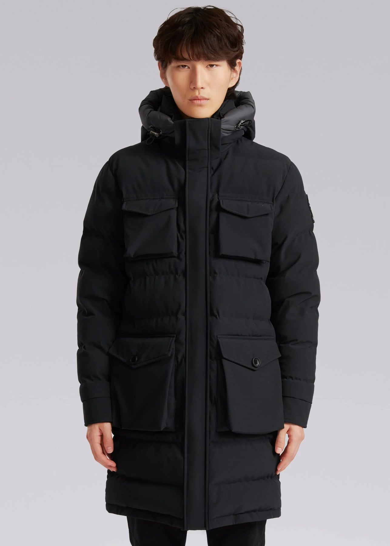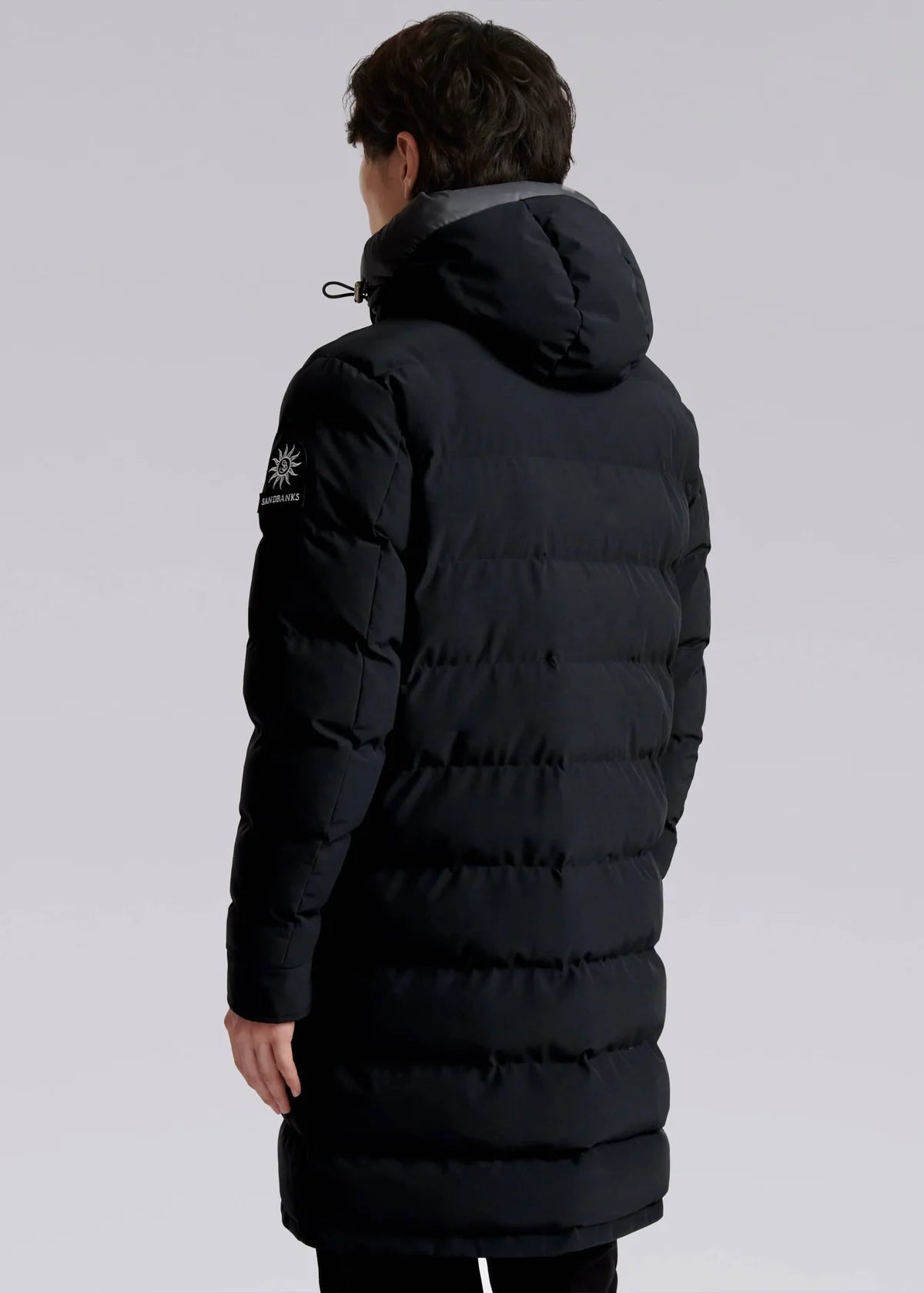 The new Sandbanks Branksome Long Puffer Jacket is made almost entirely from recycled plastic bottles. With a black water resistant shell fabric, the Branksome Long Puffer has high thermal retention and features a Sandbanks embroidered logo badges, large lower pocket/chest pocket details and detachable hood. The Branksome is back, bigger and better than ever for the Winter 24 season after being a previous best seller. The Branksome was seen all year round, whether on the terrace in the dugout or on one of the many sky sports presenters reporting pitch side including Jamie Redknapp and Gary Neville.