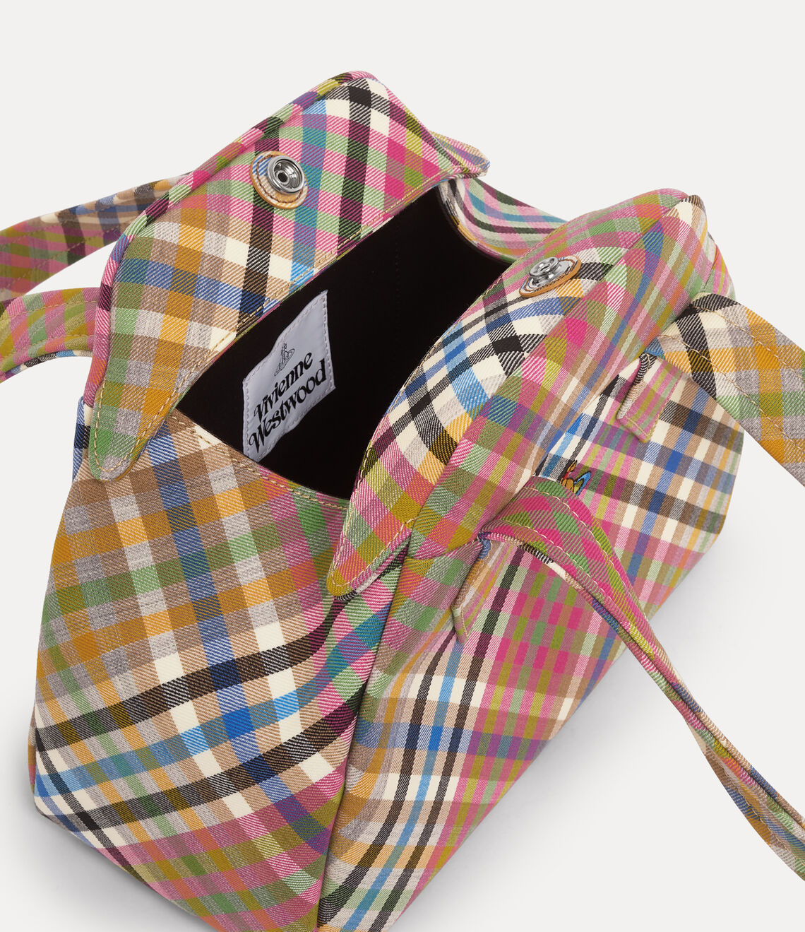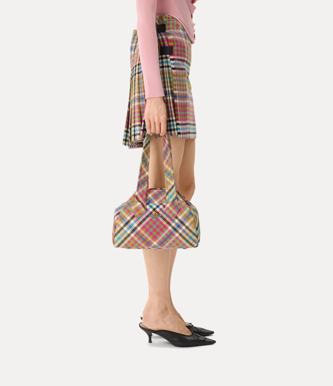 Our classic Yasmine Archive Medium handbag returns this season in a vibrant woollen 'Heather Check' motif. Inspired by the house’s archival 'Yasmine' silhouette, the design is finished with a multi-coloured embroidered orb at the front, reflecting Vivienne’s vision of propelling tradition into the future.