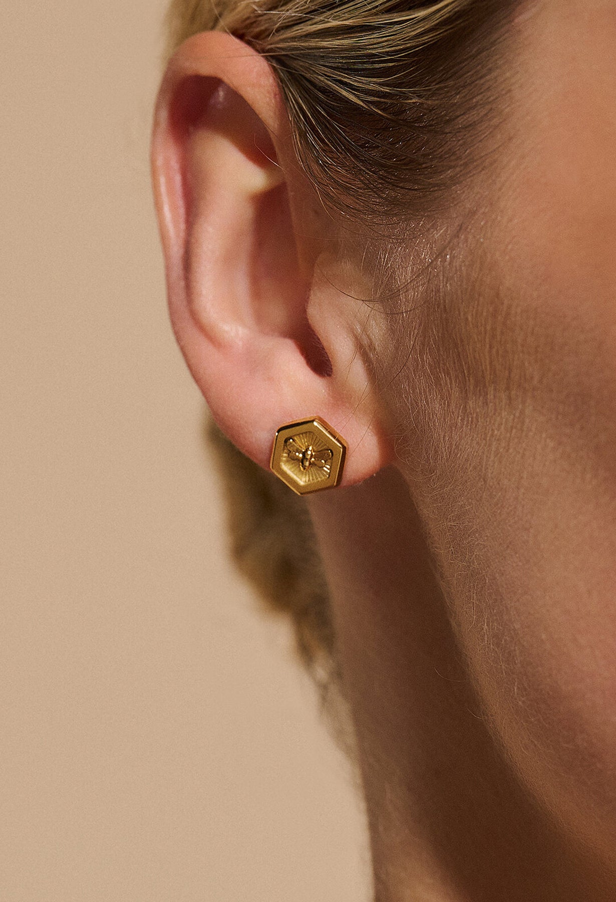 Gold plated Olivia Burton earrings with a bee emblem inside a hexagonal setting. Jewellery accessory detail.
