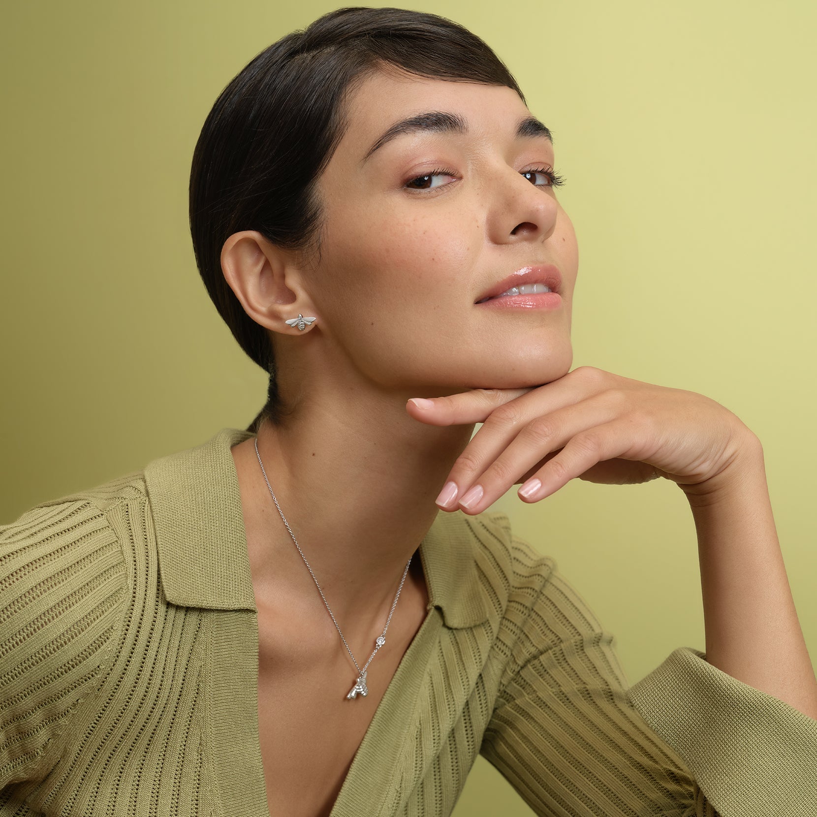 Woman wearing Olivia Burton stainless steel honey bee earrings in stainless steel