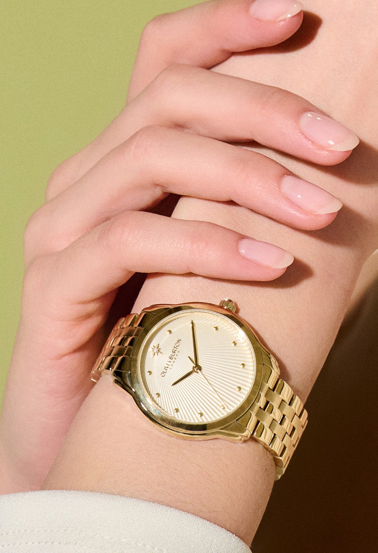 Olivia Burton Starlight gold watch. Ladies bracelet watch featuring elegant face design.