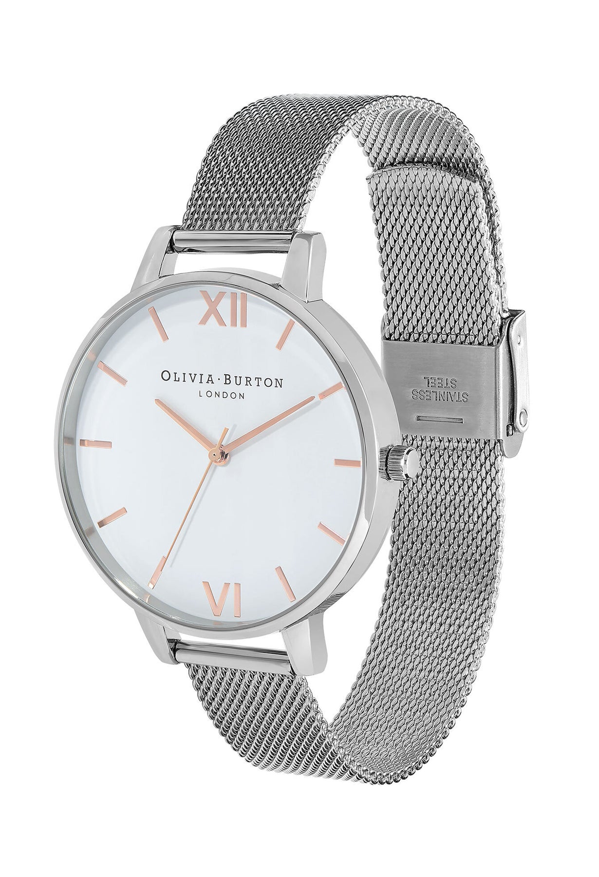 Olivia Burton watch featuring a white dial and stainless steel mesh strap, highlighting the watch's design.