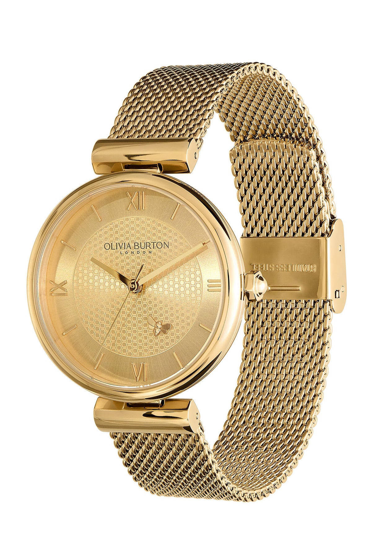 Gold Olivia Burton watch featuring a honeycomb pattern dial with bee detail and woven mesh bracelet.