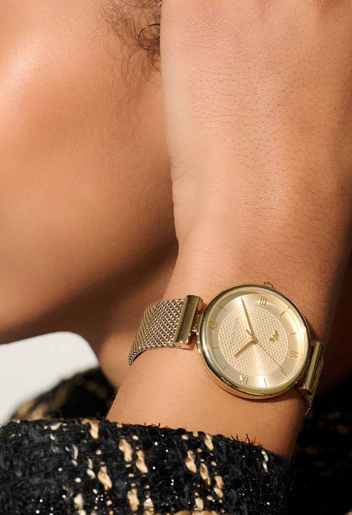 Olivia Burton gold plated watch with bee detail and mesh bracelet. Showcasing Minima collection timepiece.