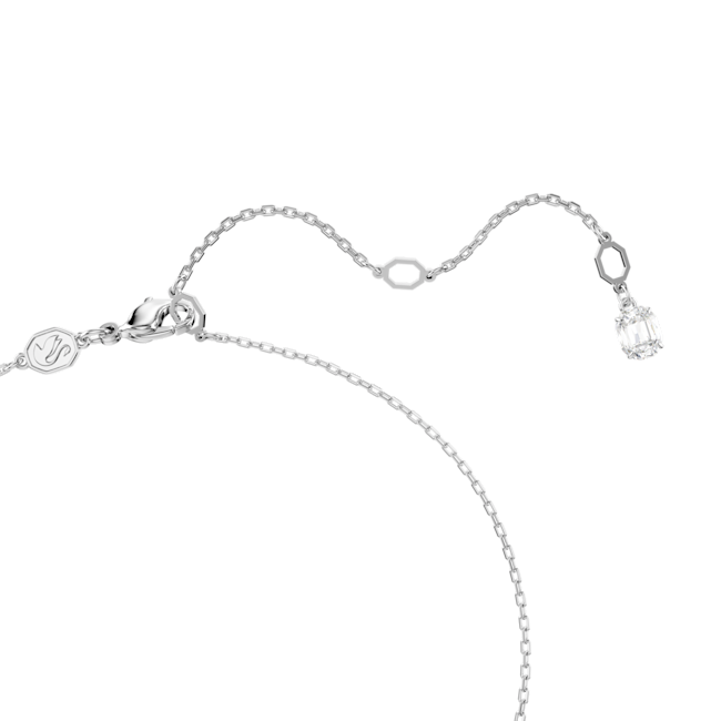 Close-up of the rhodium-plated Swarovski Hyperbola pendant, showing the adjustable chain and crystal detail.