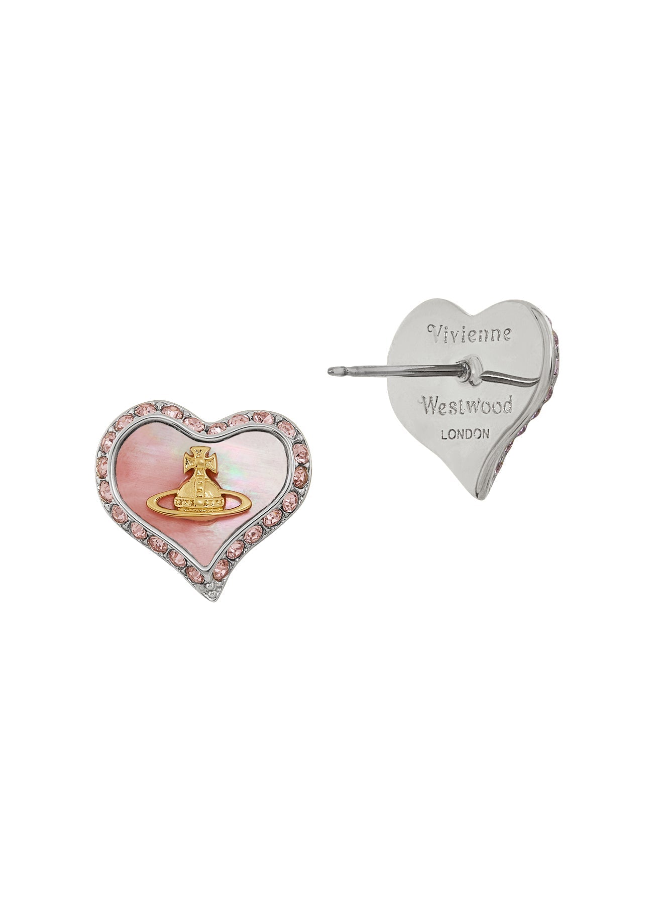 The Vivienne Westwood Petra Earrings are a romantic, heart-shaped interpretation of the brand's rebel aesthetic. This design features a captivating Pink Mother of Pearl sheet, cut into an asymmetrical heart shape that catches the light with a natural, iridescent glow. The heart is framed by a halo of sparkling crystals and finished with the signature Orb emblem in a cool Platinum tone.