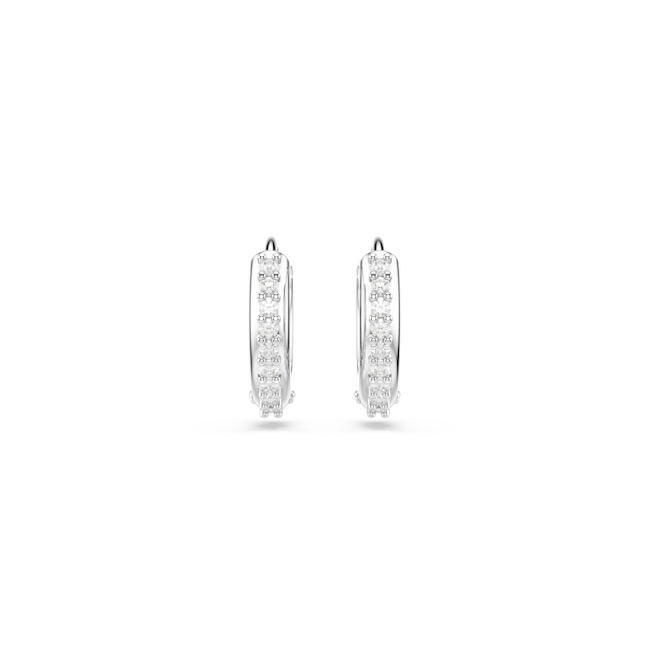 Swarovski hoop earrings, rhodium-plated, round-cut crystals. Jewelry product close-up.