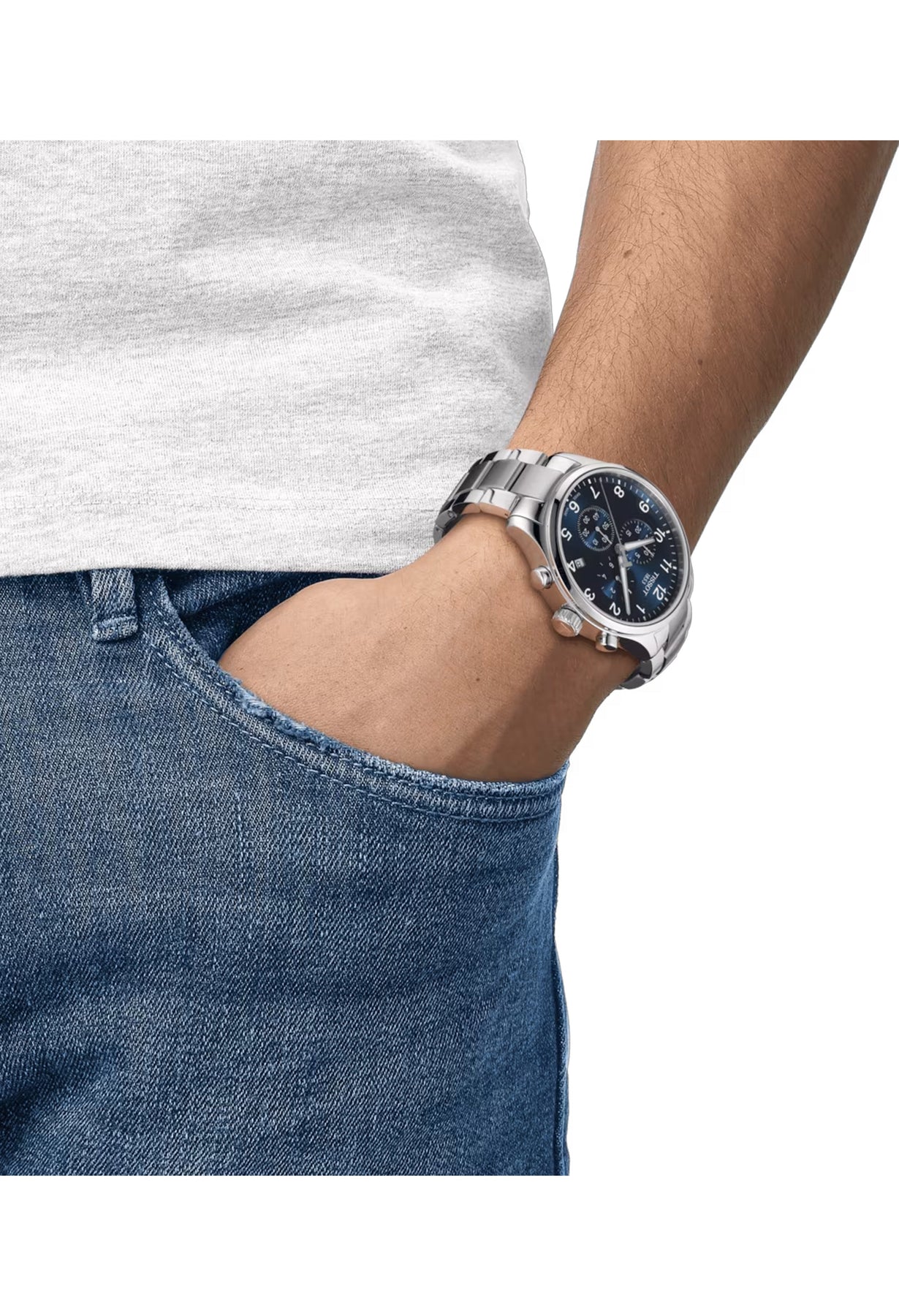 Man wearing a Tissot Chrono XL watch with a blue dial and stainless steel bracelet in a casual setting.