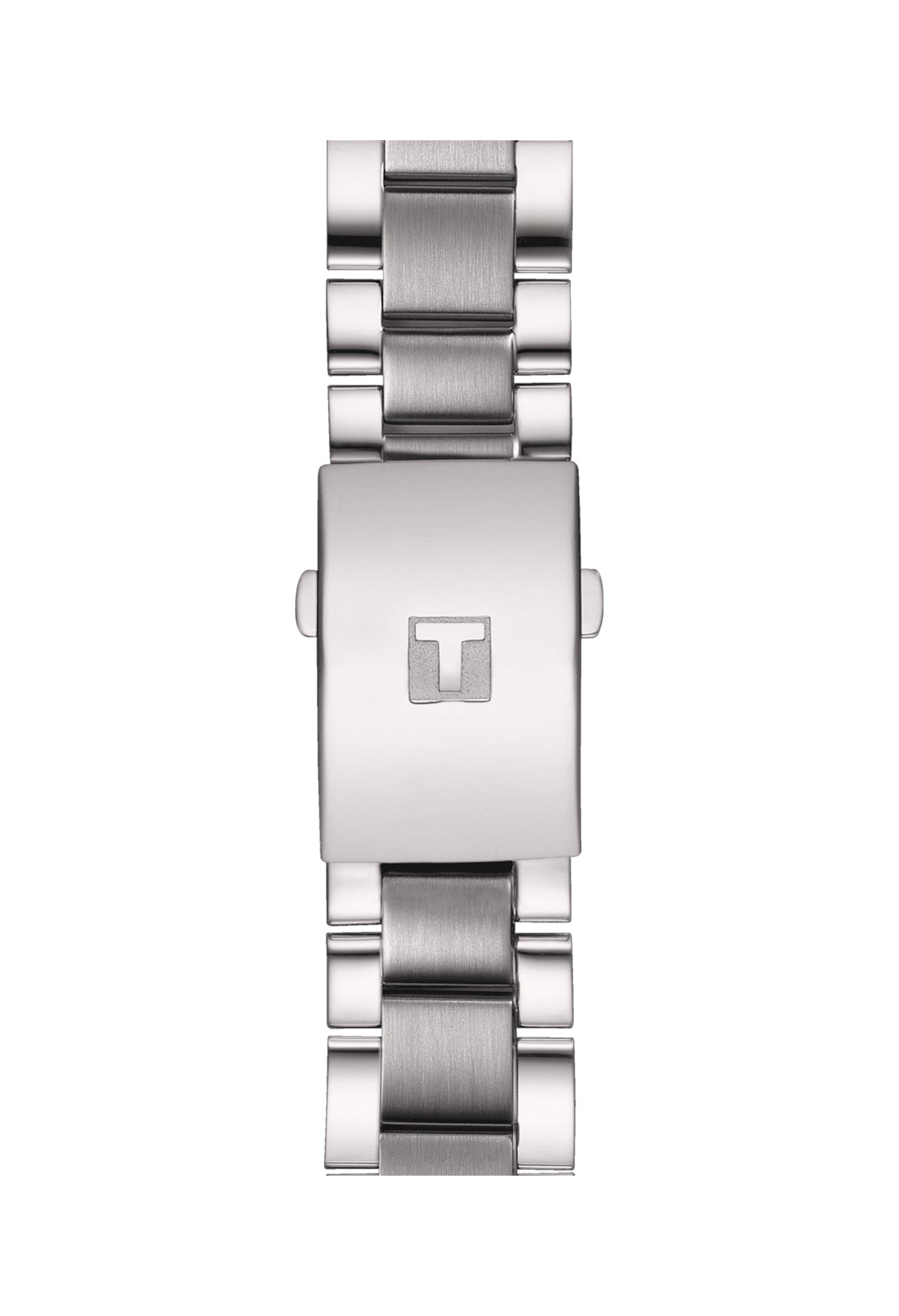 Close-up of the Tissot Chrono XL stainless steel bracelet and clasp, showcasing its design and attachment mechanism.