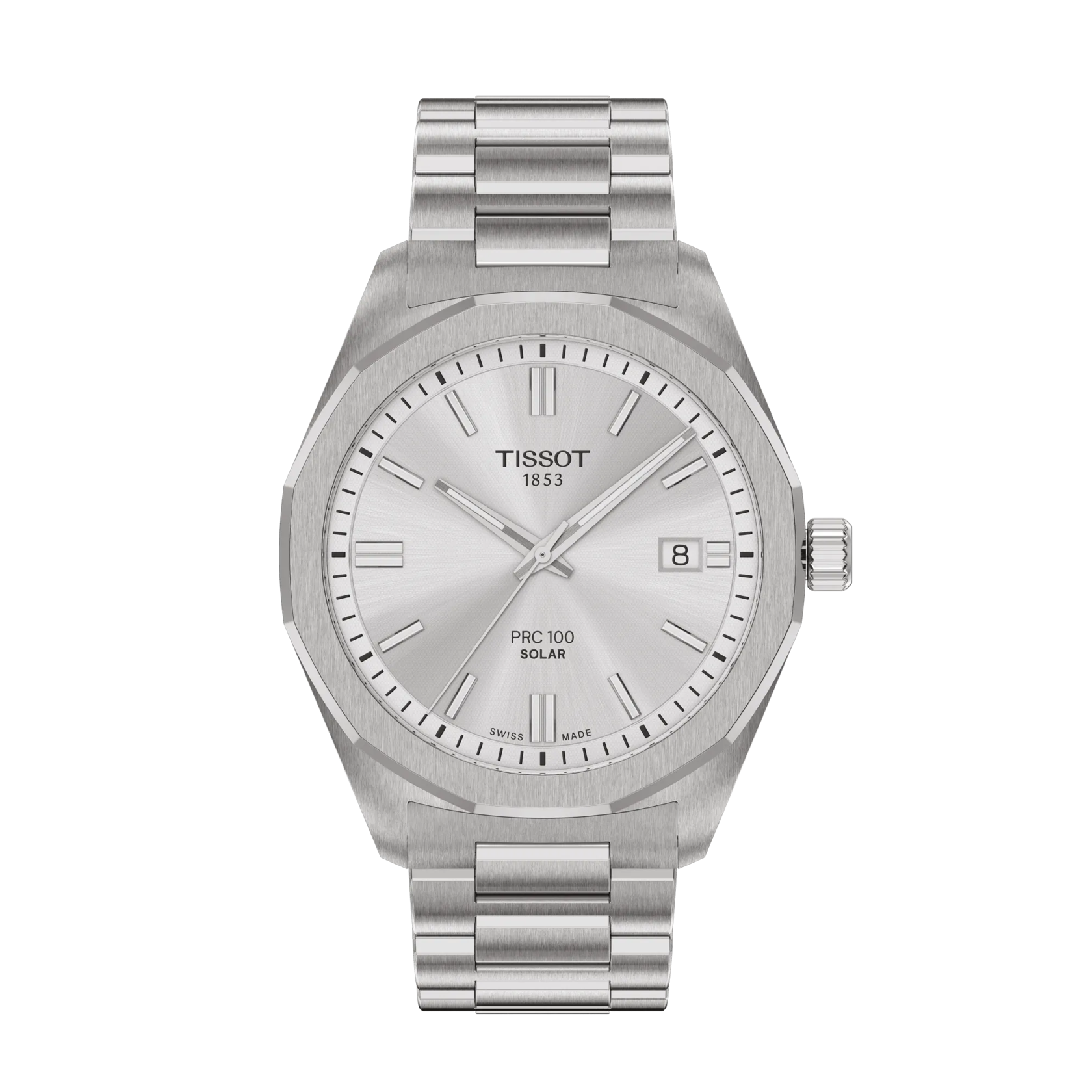 The Tissot PRC100 Solar Quartz Silver Dial Bracelet Watch by Tissot delivers precision timekeeping powered by solar energy for everyday wear.