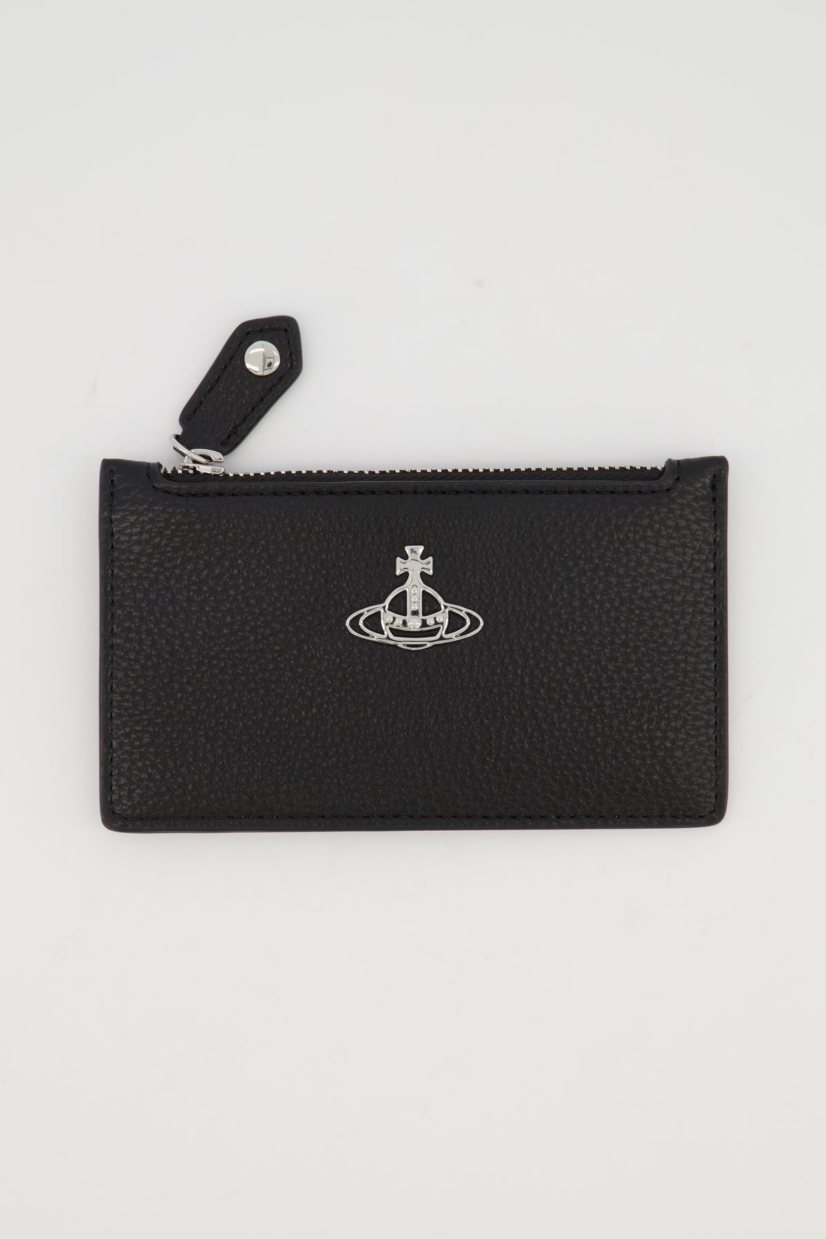 Stay organized and stylish with the Women's Vivienne Westwood Black Slim Long Card Holder. With a top-zip closure and four card slots, it's perfect for carrying your essentials. The grain effect finish adds a touch of sophistication to this rectangular silhouette, complete with a polished silver colour orb plaque.
