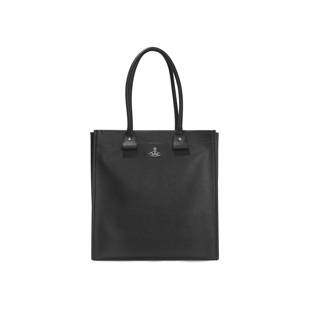 Vivienne Westwood Teddy tote bag in Black. Structured tote bag constructed from polyurethane with a saffiano-embossed finish, featuring a line orb motif on the front panel, extendable side gussets, top handles, a removable shoulder strap, and silver-tone metal hardware.
