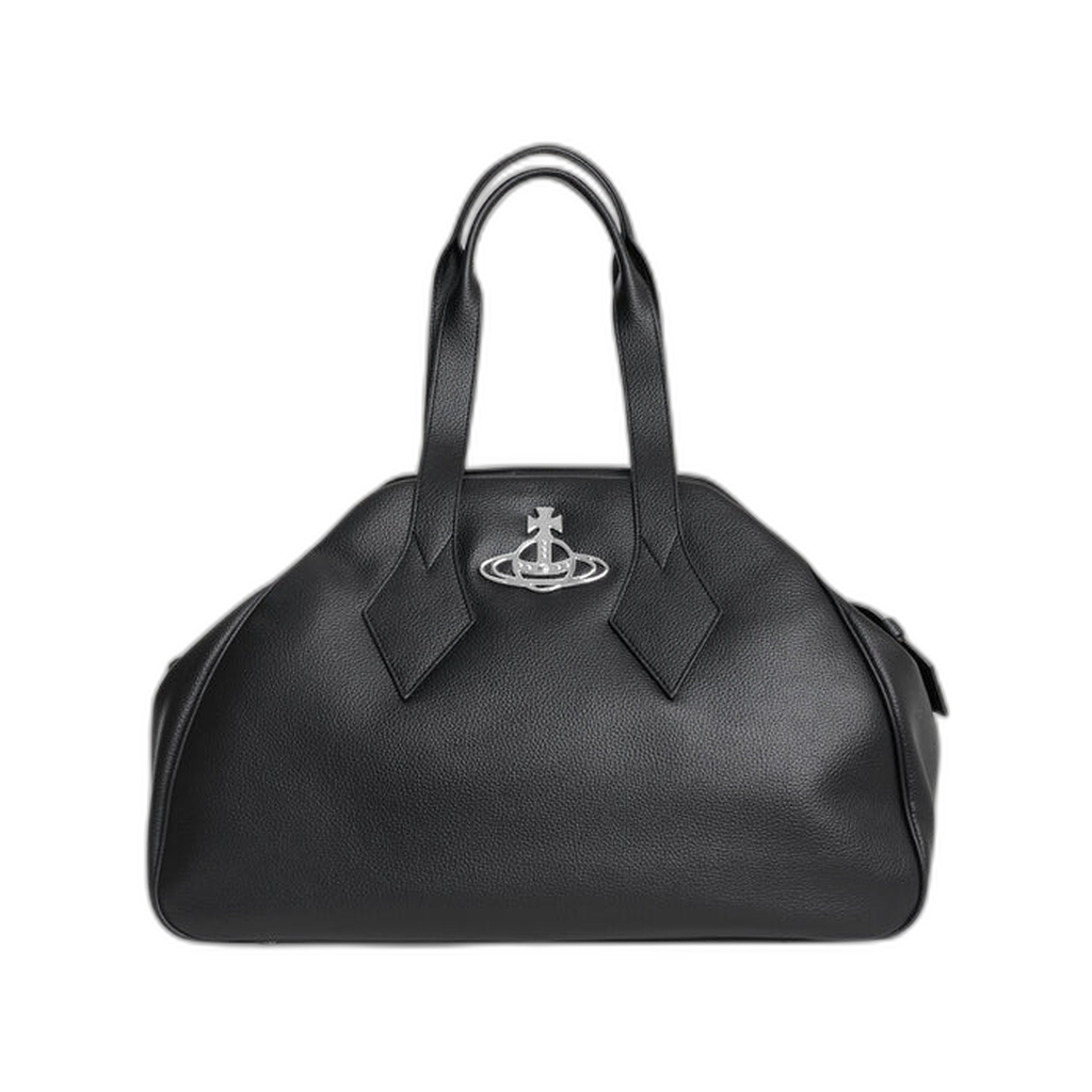 Vivienne Westwood Yasmine large handbag in Black. Structured top-handle handbag constructed from polyurethane with a grain-embossed finish, featuring a Thin Line Orb motif on the front panel, a zip fastening, and metal base studs for stability.