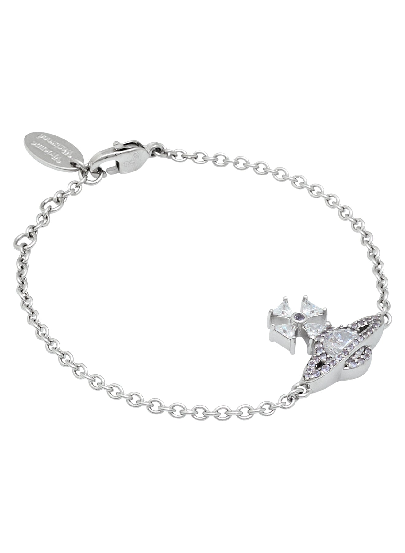 The Vivienne Westwood Mila Bracelet brings a soft, sophisticated touch of colour to the wrist. Mirroring the delicate design of the pendant, this bracelet features the "open-work" Mila Orb—a lighter, more refined outline than the solid bas-reliefs. It is plated in a premium Platinum tone and set with a sparkling mix of White and Lavender Cubic Zirconia.