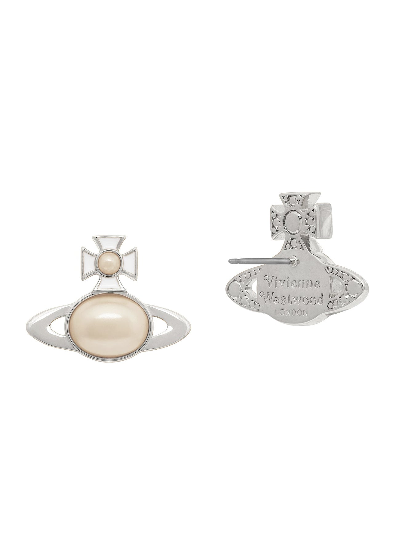 The Vivienne Westwood Gaby Pearl Earrings in Platinum tone offer a cool, sophisticated reimagining of the brand's vintage aesthetic. Unlike the high-contrast crystal pieces, the Gaby relies on the soft sheen of Creamrose Enamel and a matching central Creamrose Pearl. Plated in bright Platinum, the silver metalwork frames the cream details beautifully, creating a fresh, modern heirloom look.