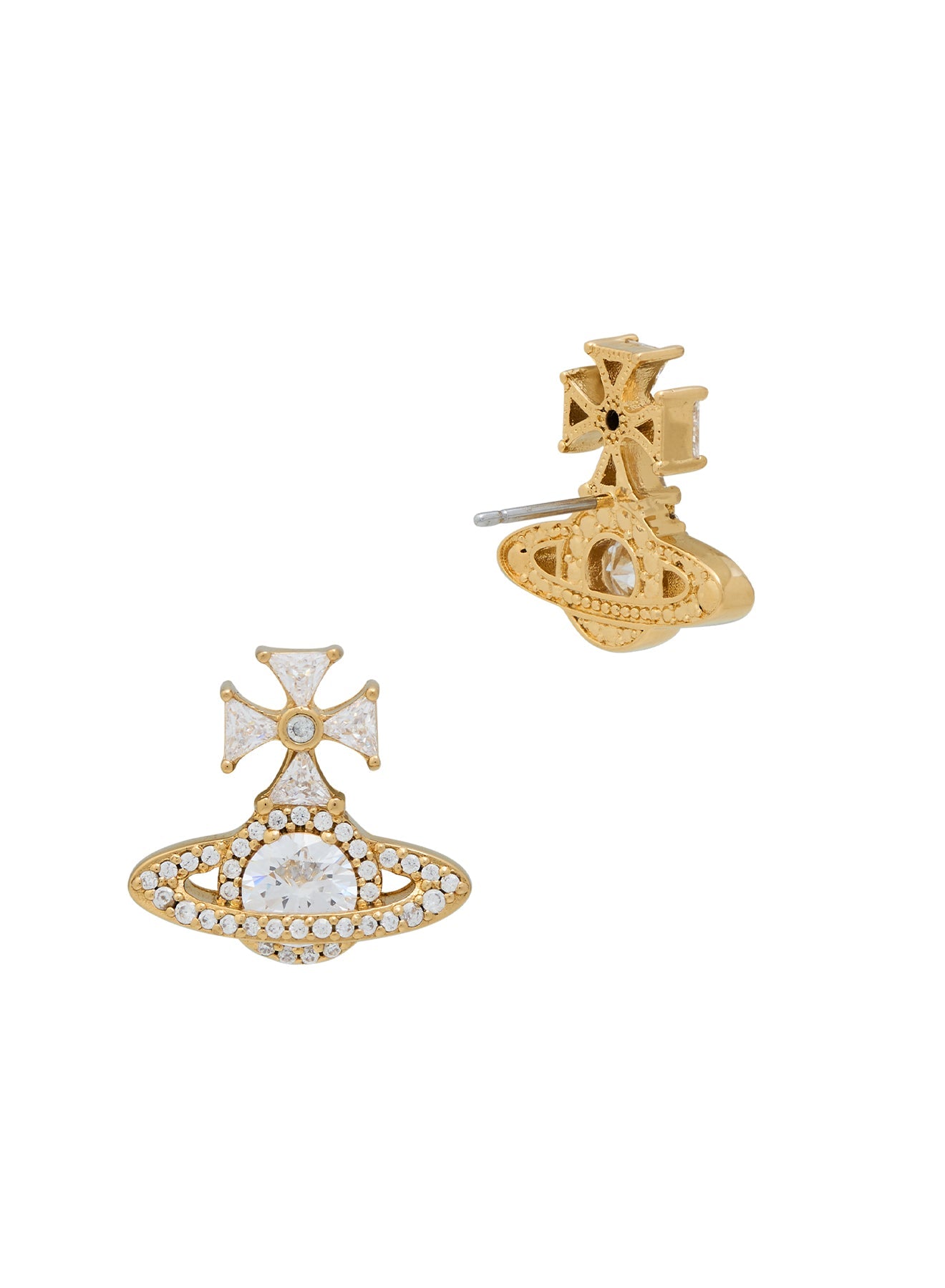 The Vivienne Westwood Mila Earrings in Gold Tone offer a warm, vintage-inspired take on the brand's iconic logo. These petite studs feature the delicate "open-work" Mila silhouette—a lighter, more refined outline of the Orb than the solid Bas Reliefs. Plated in a rich Gold Tone and set with sparkling White Cubic Zirconia, they bring a touch of classic glamour to the ear.