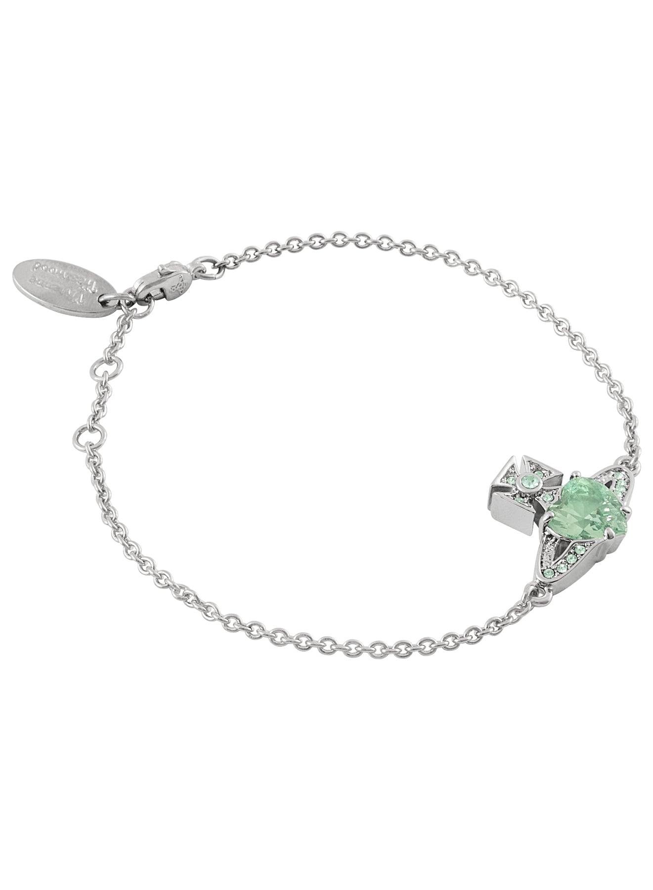 Vivienne Westwood Ariella Bracelet in platinum-tone plating with light green cubic zirconia and chrysolite crystals. The heart-shaped charm features a central orb motif with crystal detailing, set on an adjustable trace chain.