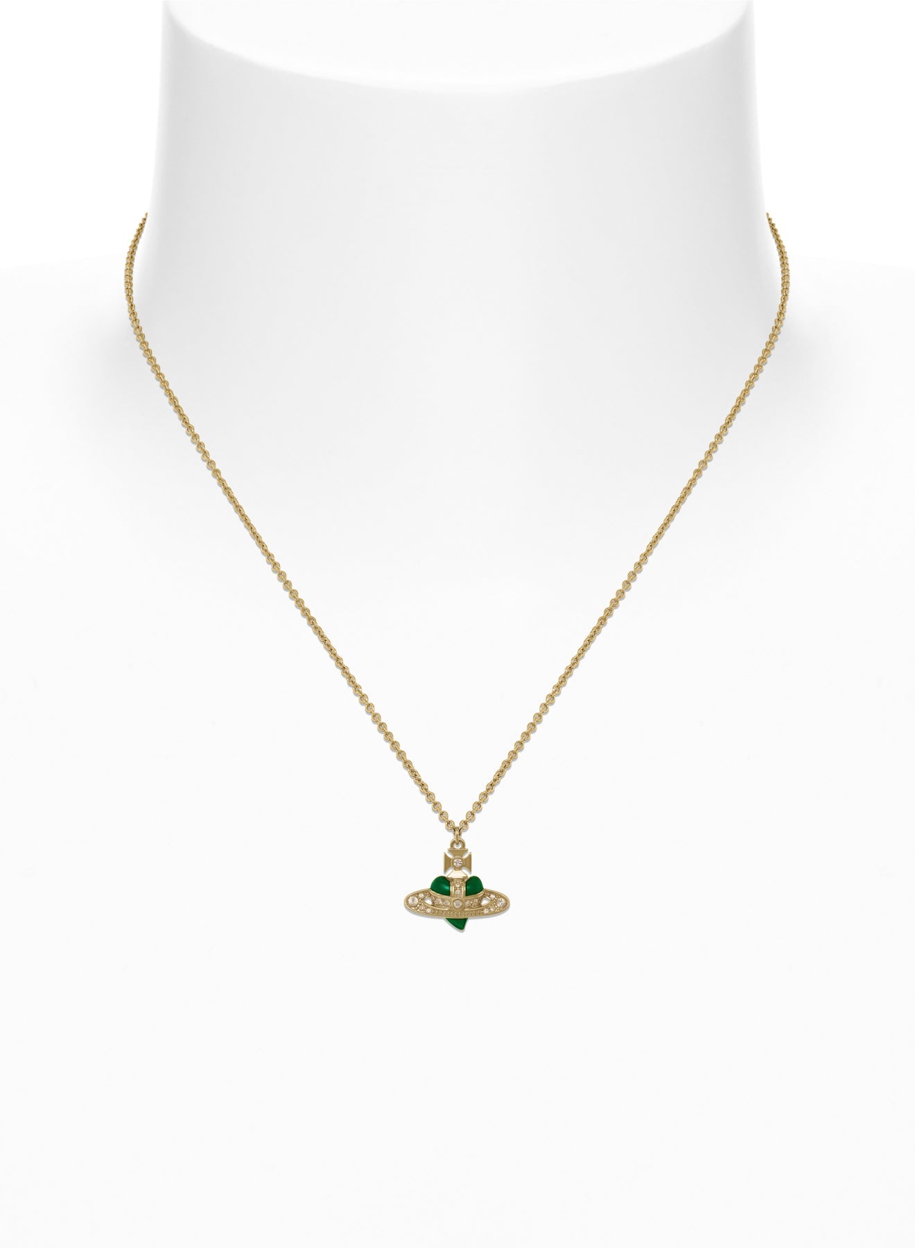 Vivienne Westwood New Diamante Heart necklace in gold-tone plating with green enamel heart and crystal embellishment. A heart-shaped Orb pendant on an adjustable chain, suited to emerald and olive palettes, warm-toned layering, and adding colour over open necklines or dark knitwear.