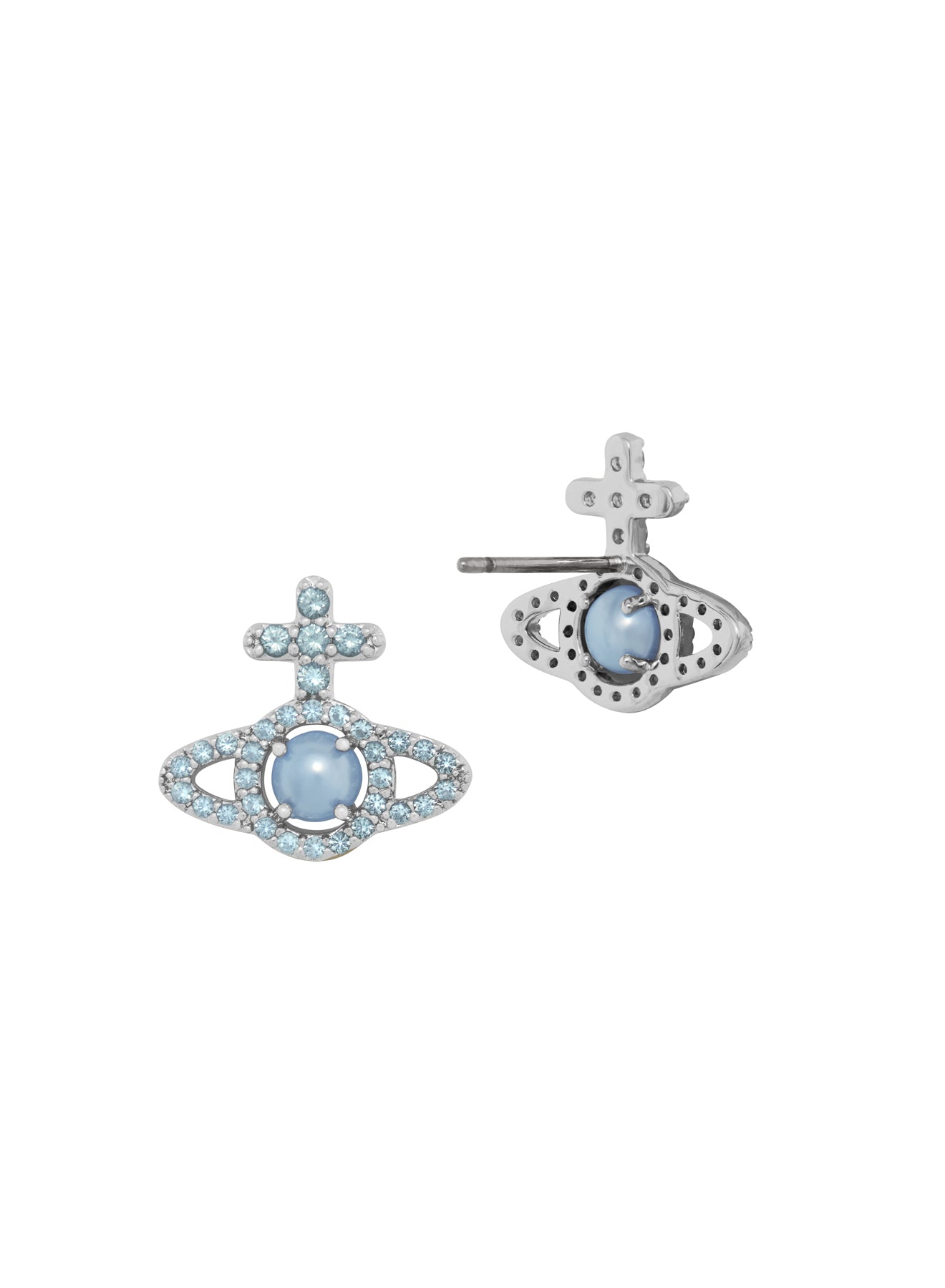 Vivienne Westwood Olympia Light Blue Pearl earrings in platinum-tone plating with light blue pearl and blue cubic zirconia. A crystal-set Orb drop with suspended pearl, suited to denim styling, coastal palettes, and adding colour to summer dresses or relaxed evening layering.
