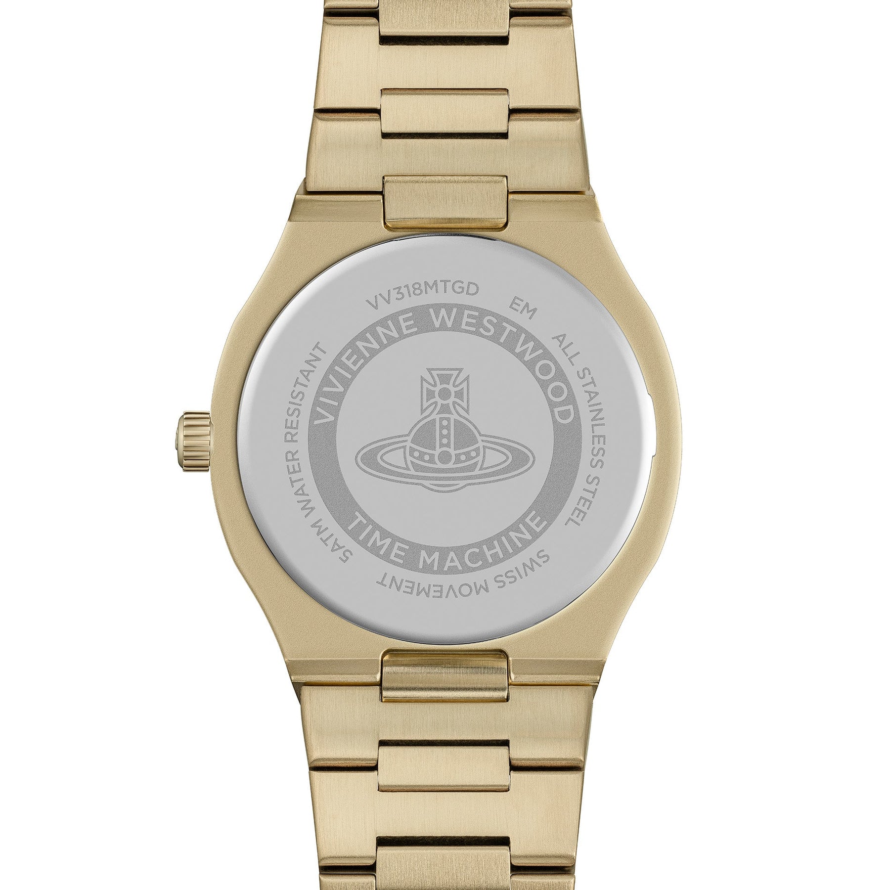 Vivienne Westwood Merton watch in yellow gold PVD with 39mm case and multi-colour pink, silver and green ombré dial. An octagonal bezel design with integrated bracelet and Swiss movement.