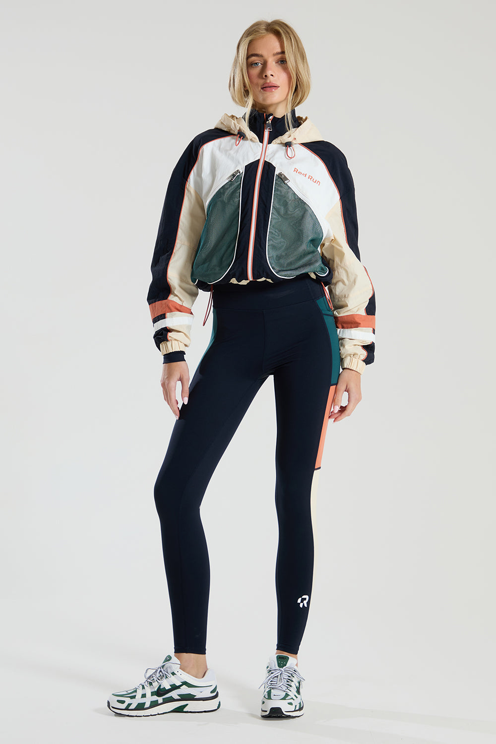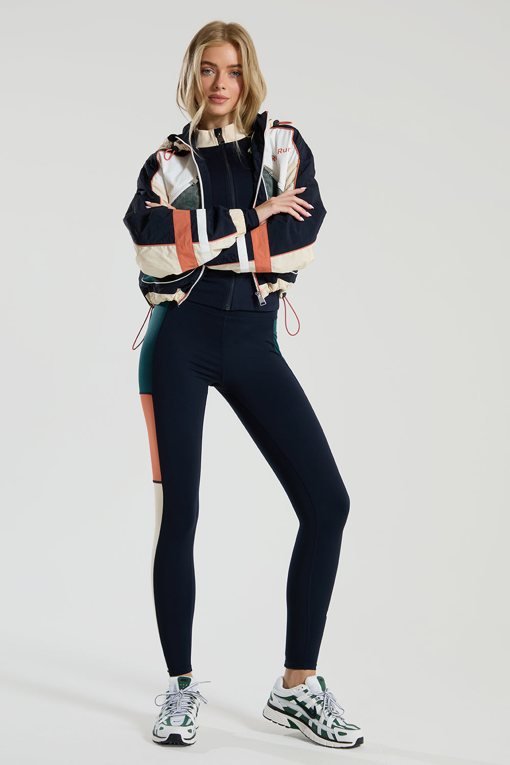 Woman wearing a colourful track jacket with navy  leggings on a light gray background
