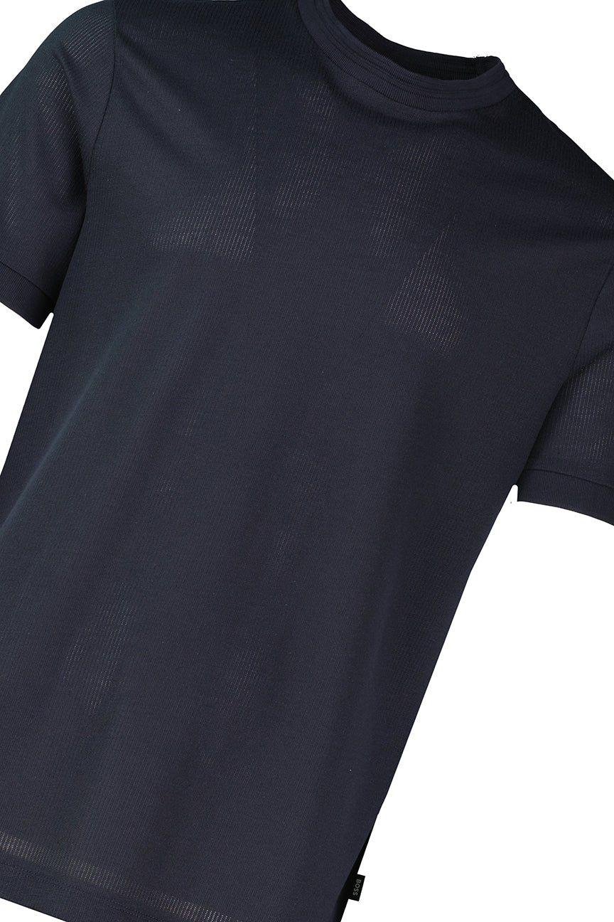 BOSS Mercerised Cotton T Shirt 50554626-DBLU in dark blue, constructed from 60% mercerised cotton and 40% lyocell with structured trims.