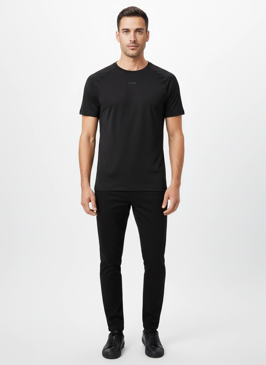 BOSS Quick-Dry Active Shorts 50531225-BLK in black, constructed from 92% recycled polyester and 8% elastane with flatlock seams for stretch comfort.