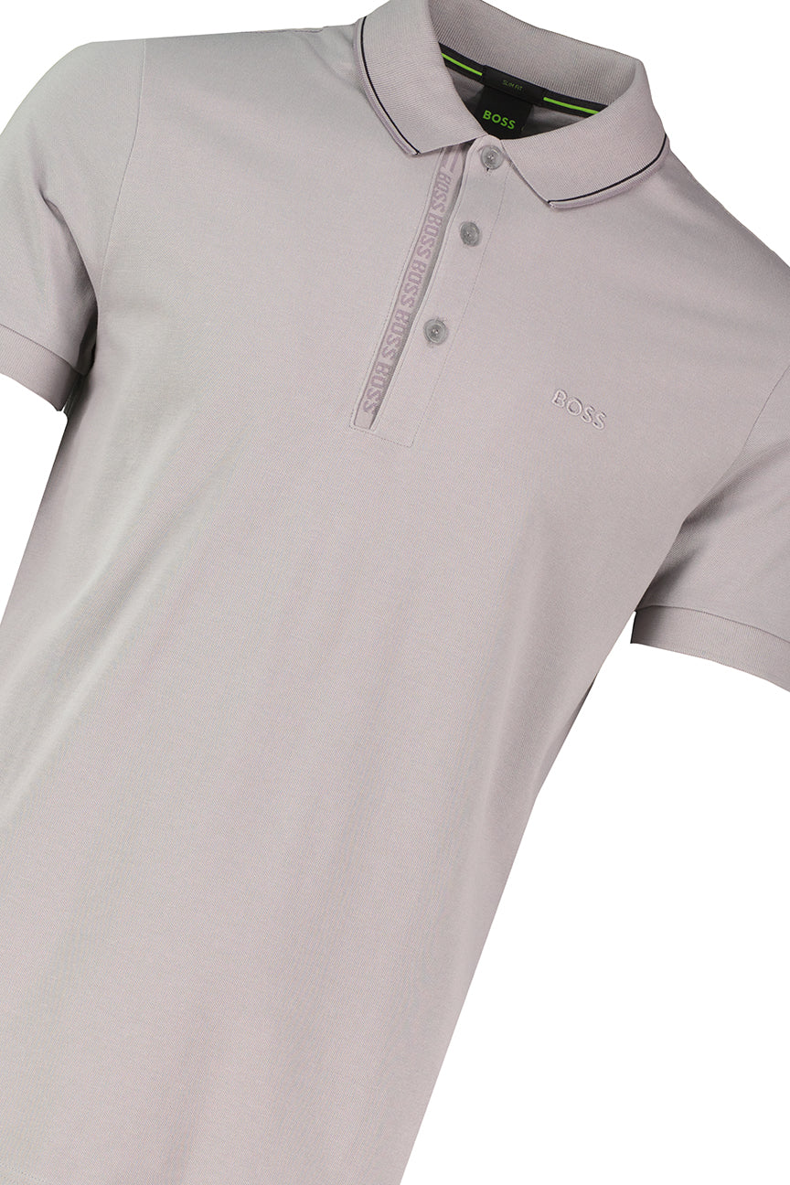 The BOSS Paule 4 Polo in Open Grey. Slim fit polo in cotton piqué. Flat-knit collar. Three-button placket. Short sleeves. Flat-knit cuffs. Tonal logo and stripe details.