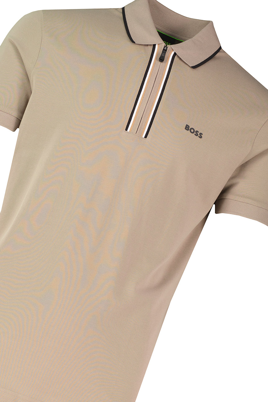 BOSS Moisture-Wicking Zip Polo Shirt 50555698-LPGRN in light/pastel green, constructed from 92% cotton and 8% elastane moisture-wicking stretch piqué for stretch performance.